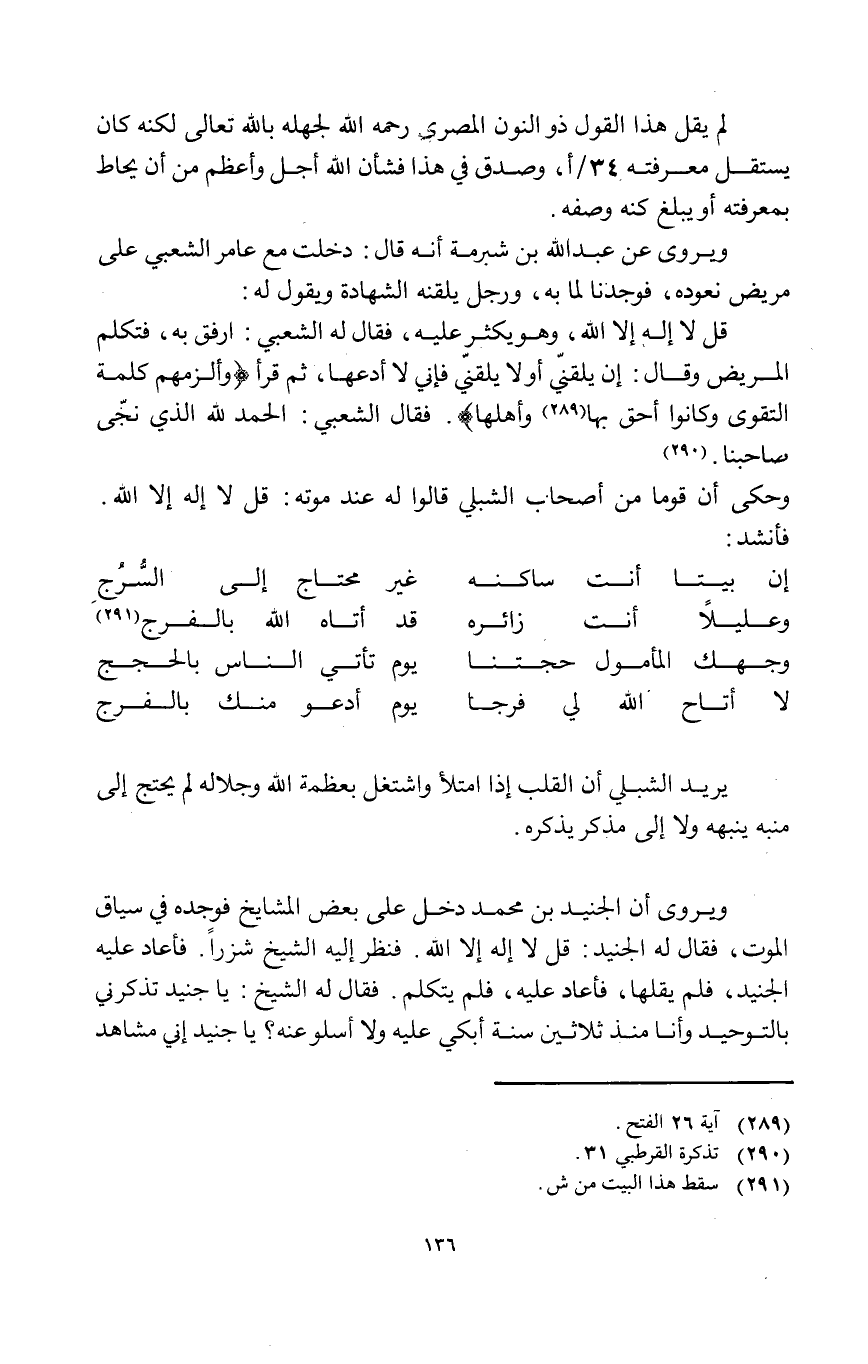ويروى أَن الْجُنَيْد بن مُحَمَّد دخل على بعض الْمَشَايِخ فَوَجَدَهُ فِي سِيَاق الْمَوْت فَقَالَ لَهُ الْجُنَيْد قل لَا إِلَه إِلَّا الله فَنظر إِلَيْهِ الشَّيْخ شزارا فَأَعَادَ عَلَيْهِ الْجُنَيْد فَلم يقلها فَأَعَادَ عَلَيْهِ فَلم يتَكَلَّم فَقَالَ لَهُ الشَّيْخ يَا جُنَيْد تذكرني بِالتَّوْحِيدِ وَأَنا مُنْذُ ثَلَاثِينَ سنة أبْكِي عَلَيْهِ وَلَا أسلو عَنهُ يَا جُنَيْد إِنِّي مشَاهد