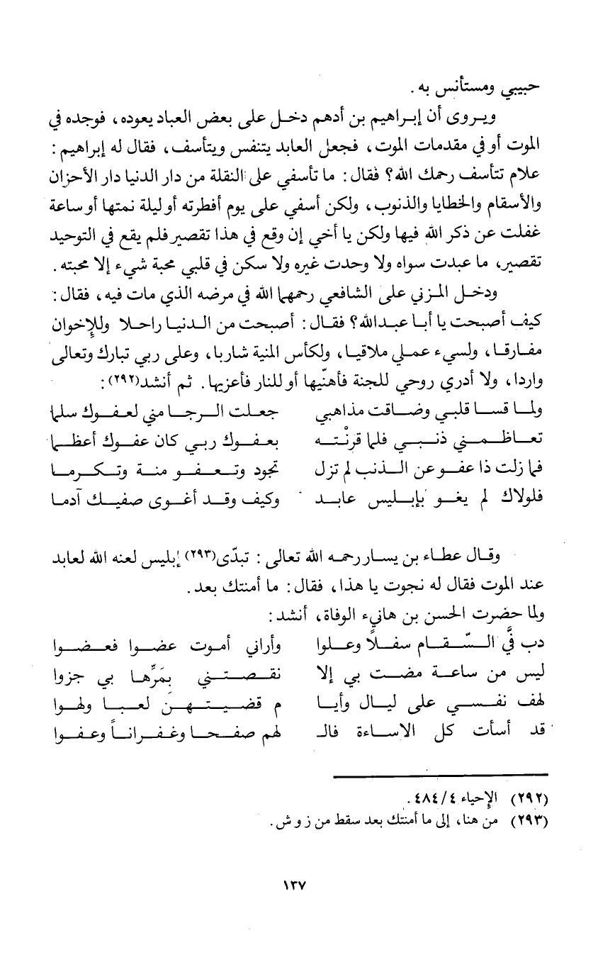 ويروى أَن إِبْرَاهِيم بن أدهم دخل على بعض الْعباد يعودهُ فَوَجَدَهُ فِي الْمَوْت أَو فِي مُقَدمَات الْمَوْت فَجعل العابد يتنفس ويتأسف فَقَالَ لَهُ إِبْرَاهِيم علام تتأسف رَحِمك الله فَقَالَ مَا تأسفي على النقلَة من دَار الدُّنْيَا دَار الأحزان والأسقام والخطايا والذنُوب وَلَكِن أسفي على يَوْم أفطرته أَو لَيْلَة نمتها أَو سَاعَة غفلت عَن ذكر الله فِيهَا وَلَكِن يَا أخي إِن وَقع فِي هَذَا تَقْصِير فَلم يَقع فِي التَّوْحِيد تَقْصِير مَا عبدت سواهُ وَلَا وحدت غَيره وَلَا سكن فِي قلبِي محبَّة شَيْء إِلَّا محبته