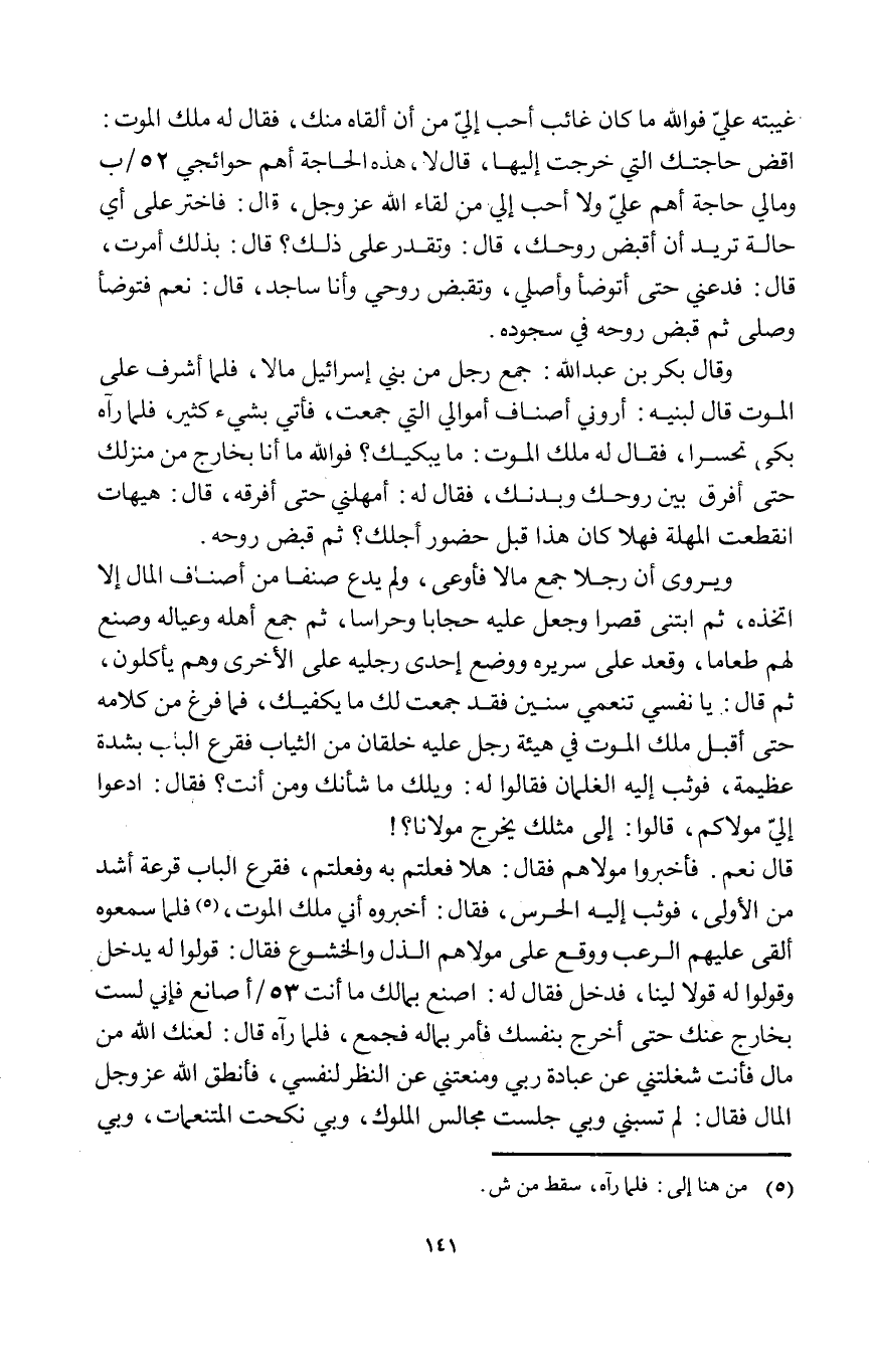 وَقَالَ بكر بن عبد الله جمع رجل من بني إِسْرَائِيل مَالا فَلَمَّا أشرف على الْمَوْت قَالَ لِبَنِيهِ أروني أَصْنَاف أَمْوَالِي الَّتِي جمعت فَأتي بِشَيْء كثير فَلَمَّا رَآهُ بَكَى تحسرا فَقَالَ لَهُ ملك الْمَوْت مَا يبكيك فوَاللَّه مَا أَنا بِخَارِج من مَنْزِلك حَتَّى أفرق بَين روحك وبدنك فَقَالَ لَهُ أمهلني حَتَّى أفرقه قَالَ هَيْهَات انْقَطَعت المهلة فَهَلا كَانَ هَذَا قبل حُضُور أَجلك ثمَّ قبض روحه