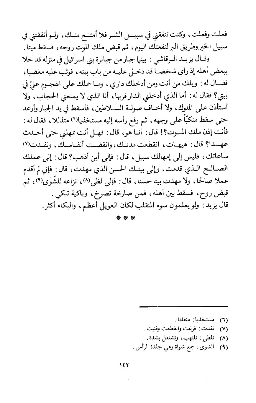 وَقَالَ يزِيد الرقاشِي بَيْنَمَا جَبَّار من جبابرة بني إِسْرَائِيل فِي منزلَة قد خلا بِبَعْض أَهله إِذْ رأى شخصا قد دخل عَلَيْهِ من بَاب بَيته فَوَثَبَ عَلَيْهِ مغضبا فَقَالَ لَهُ وَيلك من أَنْت وَمن أدْخلك دَاري وَمَا حملك على الهجوم عَليّ فِي بَيْتِي فَقَالَ لَهُ أما الَّذِي أدخلني الدَّار فربها أَنا الَّذِي لَا يَمْنعنِي الْحجاب وَلَا اسْتَأْذن على الْمُلُوك وَلَا أَخَاف صولة السلاطين فأسقط فِي يَد الْجَبَّار وأرعد حَتَّى سقط منكبا على وَجهه ثمَّ رفع رَأسه إِلَيْهِ مستخذيا متذللا فَقَالَ لَهُ فَأَنت إِذن ملك الْمَوْت قَالَ أَنا هُوَ قَالَ فَهَل أَنْت ممهلني حَتَّى أحدث عهدا قَالَ هَيْهَات انْقَطَعت مدتك وَانْقَضَت أنفاسك ونفدت ساعاتك فَلَيْسَ إِلَى إمهالك سَبِيل قَالَ فَإلَى أَيْن أذهب قَالَ إِلَى عَمَلك الصَّالح الَّذِي قدمت وَإِلَى بَيْتك الْحسن الَّذِي مهدت قَالَ فَإِنِّي لم أقدم عملا صَالحا وَلَا مهدت بَيْتا حسنا قَالَ فَإلَى لظى نزاعه للشوى ثمَّ قبض روح فَسقط بَين أَهله فَمن صارخة تصرخ وباكية تبْكي