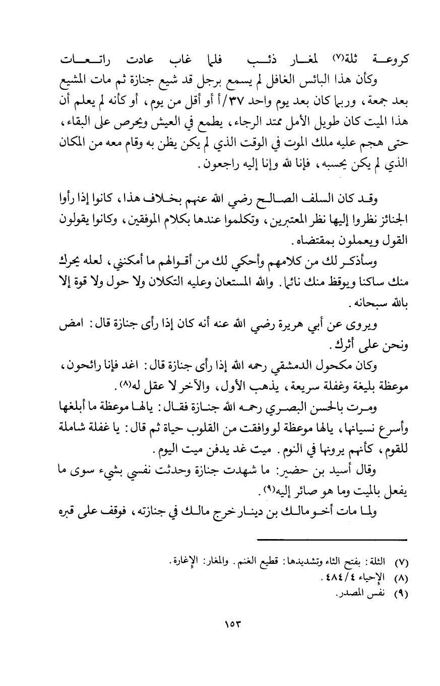 وَقد كَانَ السّلف الصَّالح رَضِي الله عَنْهُم بِخِلَاف هَذَا كَانُوا إِذا رَأَوْا الْجَنَائِز نظرُوا إِلَيْهَا نظر المعتبرين وَتَكَلَّمُوا عِنْدهَا بِكَلَام الموفقين وَكَانُوا يَقُولُونَ القَوْل ويعملون بِمُقْتَضَاهُ