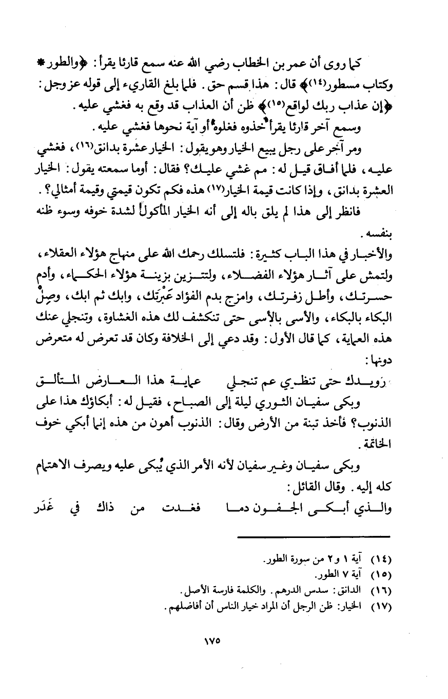 وَبكى سُفْيَان الثَّوْريّ لَيْلَة إِلَى الصَّباح فَقيل لَهُ أبكاؤك هَذَا على الذُّنُوب فَأخذ تبنة من الأَرْض وَقَالَ الذُّنُوب أَهْون من هَذِه إِنَّمَا أبْكِي خوف الخاتمة