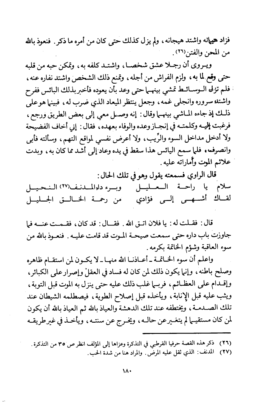 ويروى أَن رجلا عشق شخصا وَاشْتَدَّ كلفه بِهِ وَتمكن حبه من قلبه حَتَّى وَقع لما بِهِ وَلزِمَ الْفراش من أَجله وتمنع ذَلِك الشَّخْص وَاشْتَدَّ نفاره عَنهُ فَلم تزل الوسائط تمشي بَينهمَا حَتَّى وعد بِأَن يعودهُ فَأخْبر بذلك البائس ففرح وَاشْتَدَّ سروره وانجلى غمه وَجعل ينْتَظر الميعاد الَّذِي ضرب لَهُ فَبَيْنَمَا هُوَ على ذَلِك إِذْ جَاءَهُ الْمَاشِي بَينهمَا وَقَالَ إِنَّه وصل معي إِلَى بعض الطَّرِيق وَرجع فرغبت إِلَيْهِ وكلمته فِي إنجاز وعده وَالْوَفَاء بعهده فَقَالَ إِنِّي أَخَاف الفضيحة وَلَا أَدخل مدَاخِل السوء والريب وَلَا أعرض نَفسِي لمواقع التهم وَسَأَلته فَأبى وَانْصَرف فَلَمَّا سمع اليائس هَذَا سقط فِي يَده وَعَاد إِلَى أَشد مِمَّا كَانَ بِهِ وبدت علائم الْمَوْت وأماراته عَلَيْهِ