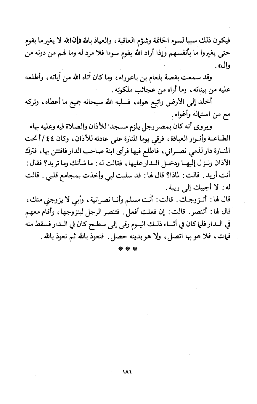 ويروى أَنه كَانَ بِمصْر رجل يلْزم مَسْجِدا للأذان وَالصَّلَاة فِيهِ وَعَلِيهِ بهاء الطَّاعَة وأنوار الْعِبَادَة فرقي يَوْمًا المنارة على عَادَته للأذان وَكَانَ تَحت المنارة دَار لذِمِّيّ نَصْرَانِيّ فَاطلع فِيهَا فَرَأى ابْنة صَاحب الدَّار فَافْتتنَ بهَا فَترك الْأَذَان وَنزل إِلَيْهَا وَدخل الدَّار عَلَيْهَا فَقَالَت لَهُ مَا شَأْنك وَمَا تُرِيدُ فَقَالَ أَنْت أُرِيد قَالَت لماذا قَالَ لَهَا قد سلبت لبي وَأخذت بِمَجَامِع قلبِي قَالَت لَهُ لَا أجيبك إِلَى رِيبَة