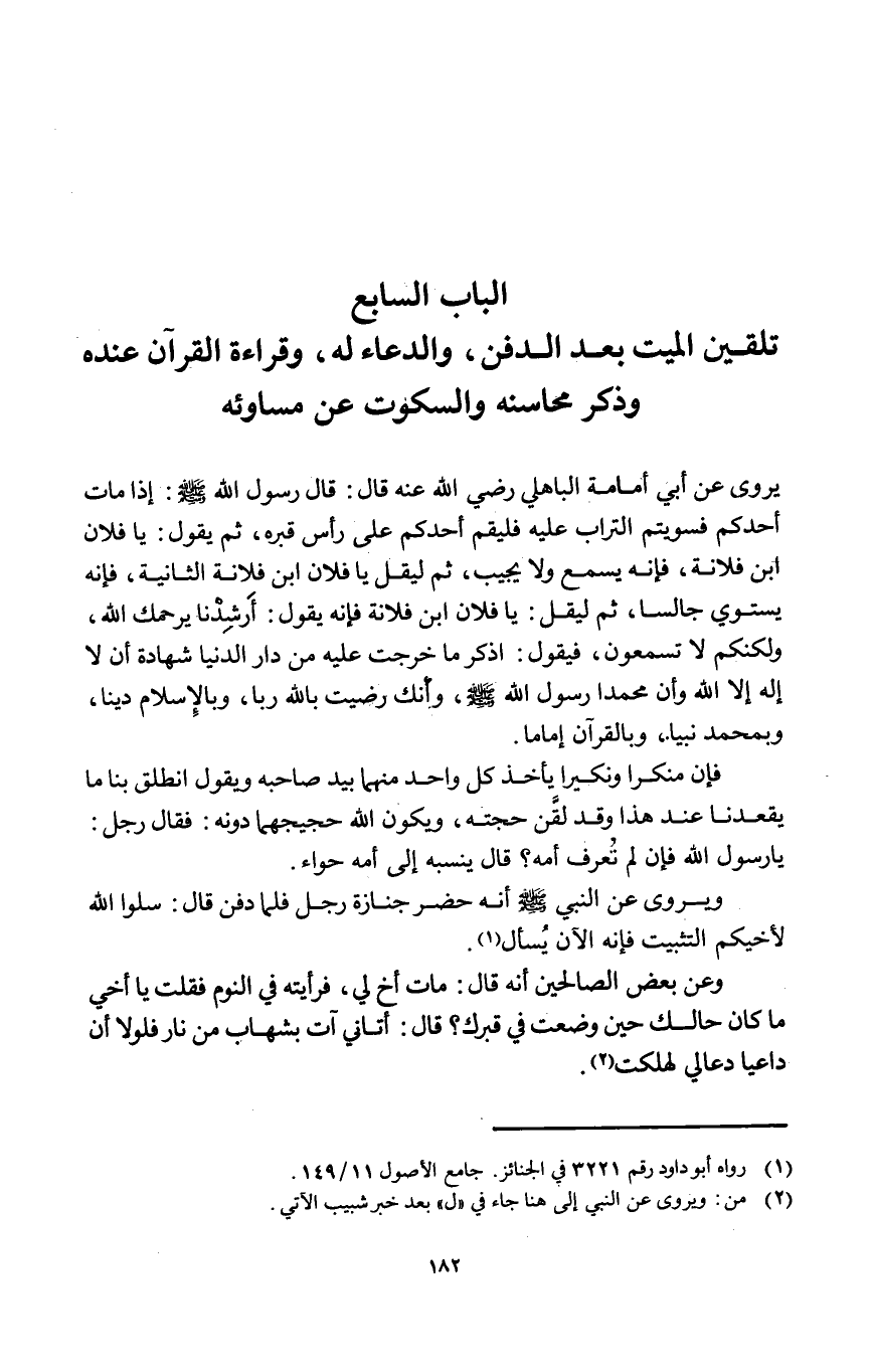 يرْوى عَن أبي أُمَامَة الْبَاهِلِيّ رَضِي الله عَنهُ قَالَ قَالَ رَسُول الله صلى الله عَلَيْهِ وَسلم إِذا مَاتَ أحدكُم فسويتم التُّرَاب عَلَيْهِ فَليقمْ أحدكُم على رَأس قَبره ثمَّ يَقُول يَا فلَان ابْن فُلَانَة فَإِنَّهُ يسمع وَلَا يُجيب ثمَّ ليقل يَا فلَان ابْن فُلَانَة الثَّانِيَة فَإِنَّهُ يَسْتَوِي جَالِسا ثمَّ ليقل يَا فلَان ابْن فُلَانَة فَإِنَّهُ يَقُول أرشدنا يَرْحَمك الله وَلَكِنَّكُمْ لَا تَسْمَعُونَ فَيَقُول اذكر مَا خرجت عَلَيْهِ من دَار الدُّنْيَا شَهَادَة أَن لَا إِلَه إِلَّا الله وَأَن مُحَمَّدًا رَسُول الله صلى الله عَلَيْهِ وَسلم وَأَنَّك رضيت بِاللَّه رَبًّا وَبِالْإِسْلَامِ دينا وَبِمُحَمَّدٍ نَبيا وَبِالْقُرْآنِ إِمَامًا