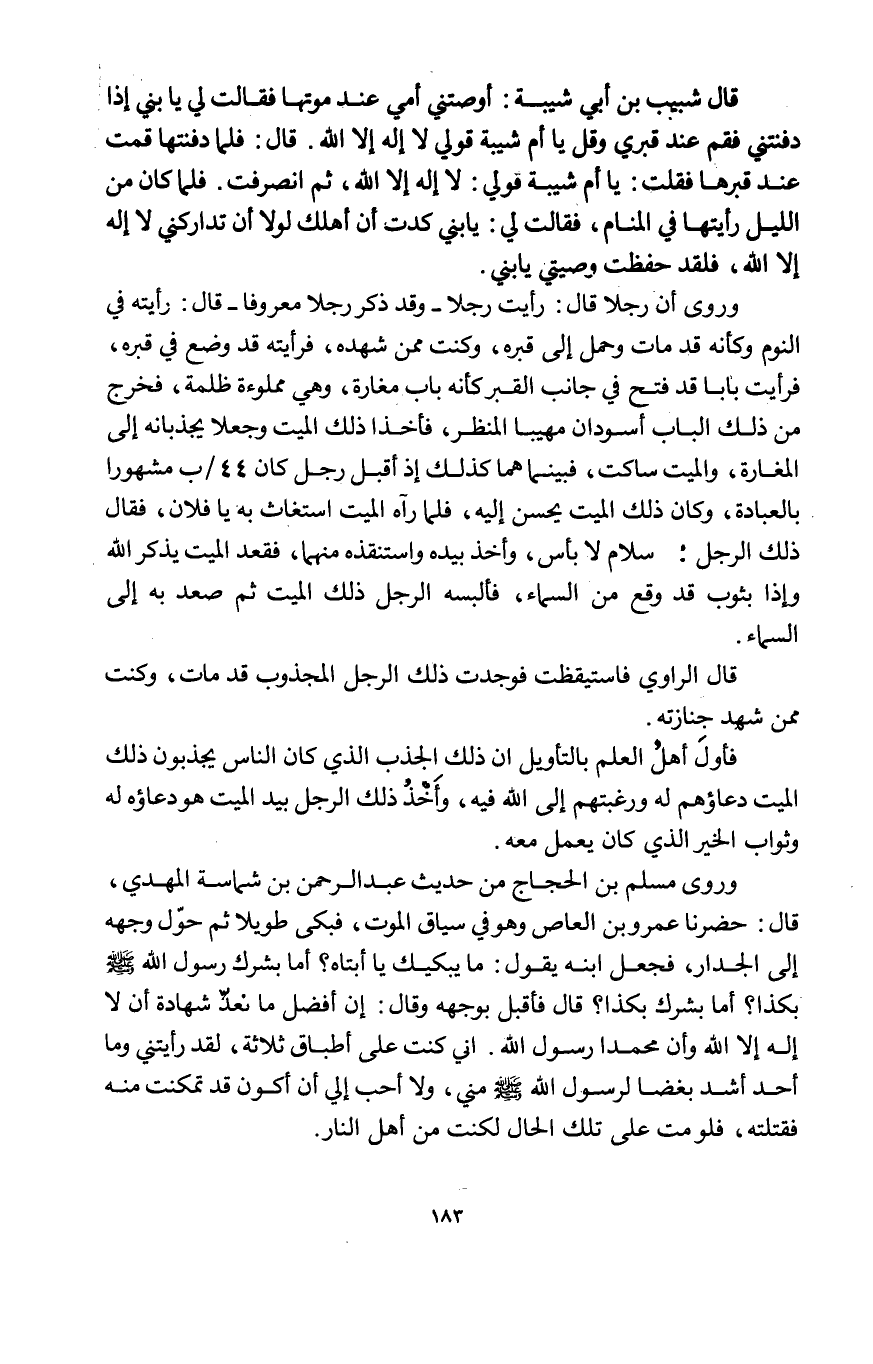 قَالَ شبيب بن أبي شيبَة أوصتني أُمِّي عِنْد مَوتهَا فَقَالَت لي يَا بني إِذا دفنتني فَقُمْ عِنْد قَبْرِي وَقل يَا أم شيبَة قولي لَا إِلَه إِلَّا الله قَالَ فَلَمَّا دفنتها قُمْت عِنْد قبرها فَقلت يَا أم شيبَة قولي لَا إِلَه إِلَّا الله ثمَّ انصرفت فَلَمَّا كَانَ من اللَّيْل رَأَيْتهَا فِي الْمَنَام فَقَالَت لي يَا بني كدت أَن أهلك لَوْلَا أَن تداركني لَا إِلَه إِلَّا الله فَلَقَد حفظت وصيتي يَا بني