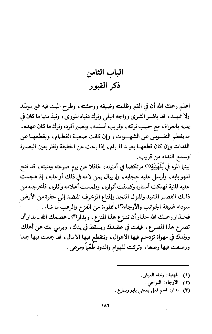 اعْلَم رَحِمك الله أَن فِي الْقَبْر وظلمته وضيقه ووحشته وَطرح الْمَيِّت فِيهِ غير موسد وَلَا ممهد قد بَاشر الثرى وواجه البلى وَترك دُنْيَاهُ للورى ونبذ مِنْهَا مَا كَانَ فِي يَدَيْهِ بالعراء مَعَ حبيب تَركه وَقَرِيب أسلمه ونصير أفرده وَترك مَا كَانَ عَهده مَا يفطم النُّفُوس عَن الشَّهَوَات وَإِن كَانَت صعبة الْفِطَام ويقطعها عَن اللَّذَّات وَإِن كَانَ قطعهَا بعيد المرام إِذا بحث عَن الْحَقِيقَة وَنظر بِعَين البصيرة وَسمع النداء من قريب