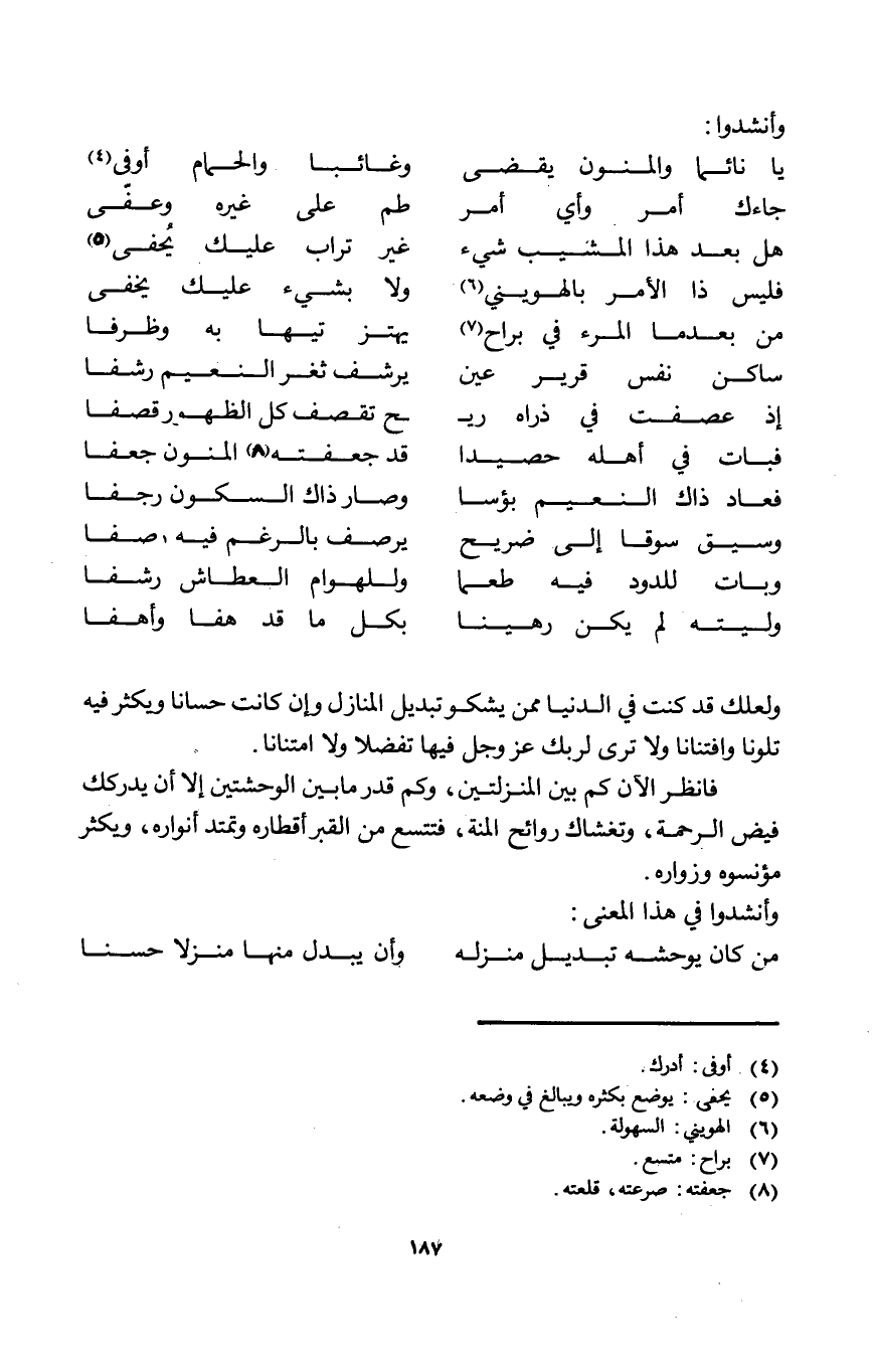 ولعلك قد كنت فِي الدُّنْيَا مِمَّن يشكو تَبْدِيل الْمنَازل وَإِن كَانَت حسانا وَيكثر فِيهِ تلونا وافتنانا وَلَا ترى لِرَبِّك عز وَجل فِيهَا تفضلا وَلَا امتنانا