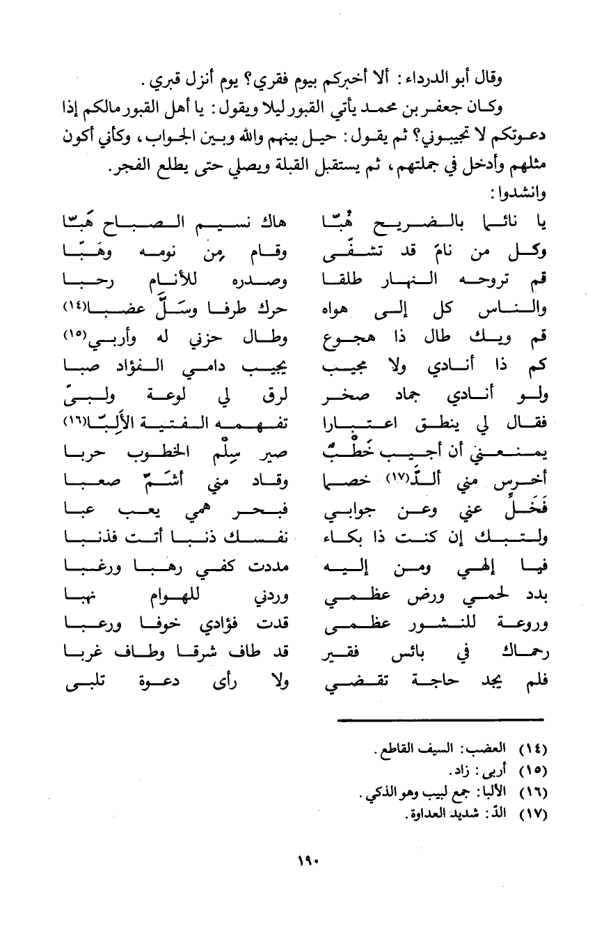 وَكَانَ جَعْفَر بن مُحَمَّد يَأْتِي الْقُبُور لَيْلًا وَيَقُول يَا أهل الْقُبُور مالكم إِذا دعوتكم لَا تُجِيبُونِي ثمَّ يَقُول حيل بَينهم وَالله وَبَين الْجَواب وَكَأَنِّي أكون مثلهم وَأدْخل فِي جُمْلَتهمْ ثمَّ يسْتَقْبل الْقبْلَة وَيُصلي حَتَّى يطلع الْفجْر