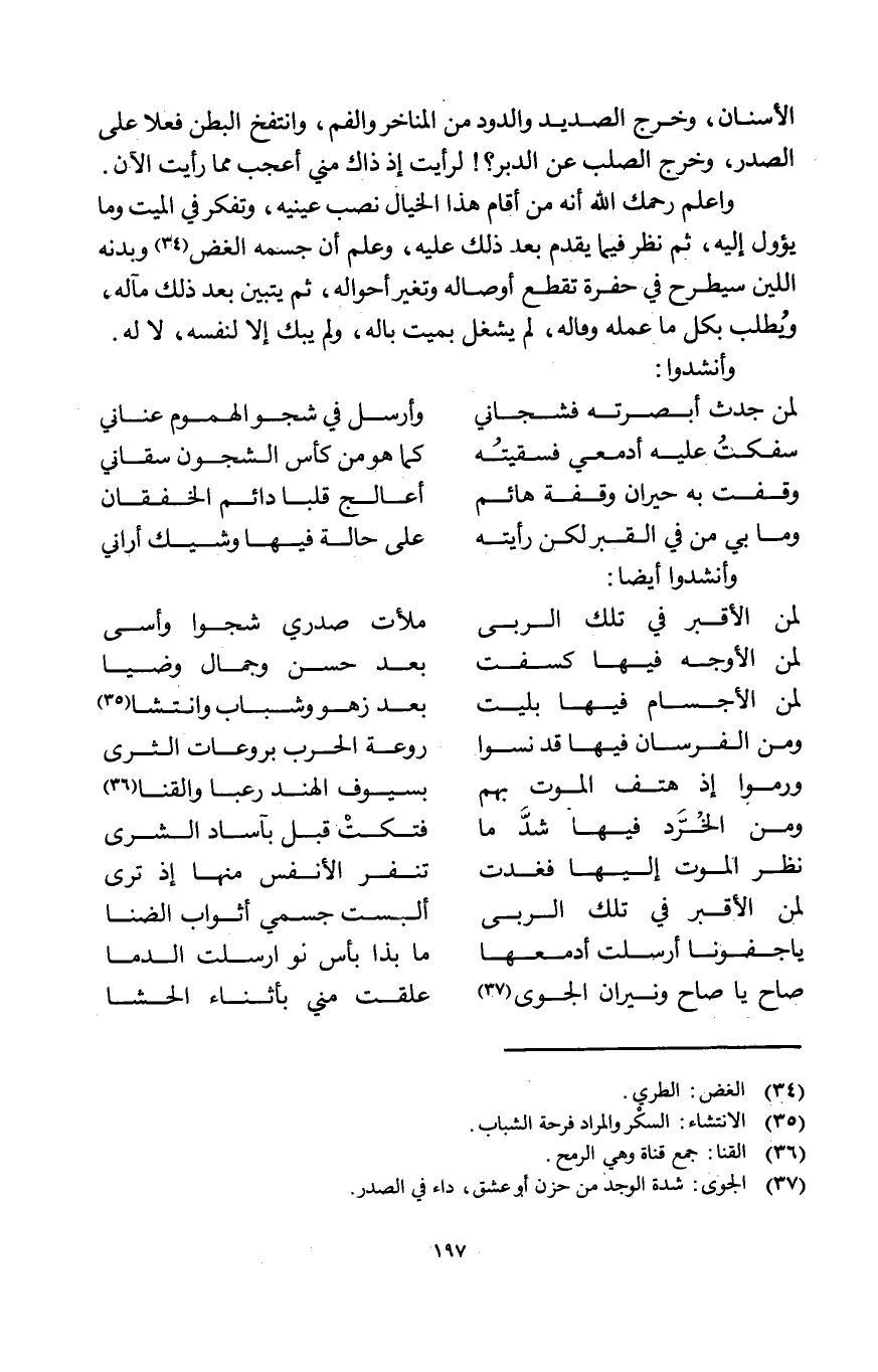 وَاعْلَم رَحِمك الله أَنه من أَقَامَ هَذَا الخيال نصب عَيْنَيْهِ وتفكر فِي الْمَيِّت وَمَا يؤول إِلَيْهِ ثمَّ نظر فِيمَا يقدم بعد ذَلِك عَلَيْهِ وَعلم أَن جِسْمه الغض وبدنه اللين سيطرح فِي حُفْرَة تقطع أوصاله وَتغَير أَحْوَاله ثمَّ يتَبَيَّن بعد ذَلِك مآله وَيطْلب بِكُل مَا عمله وَقَالَهُ لم يشغل بميت باله وَلم يبك إِلَّا لنَفسِهِ لَا لَهُ