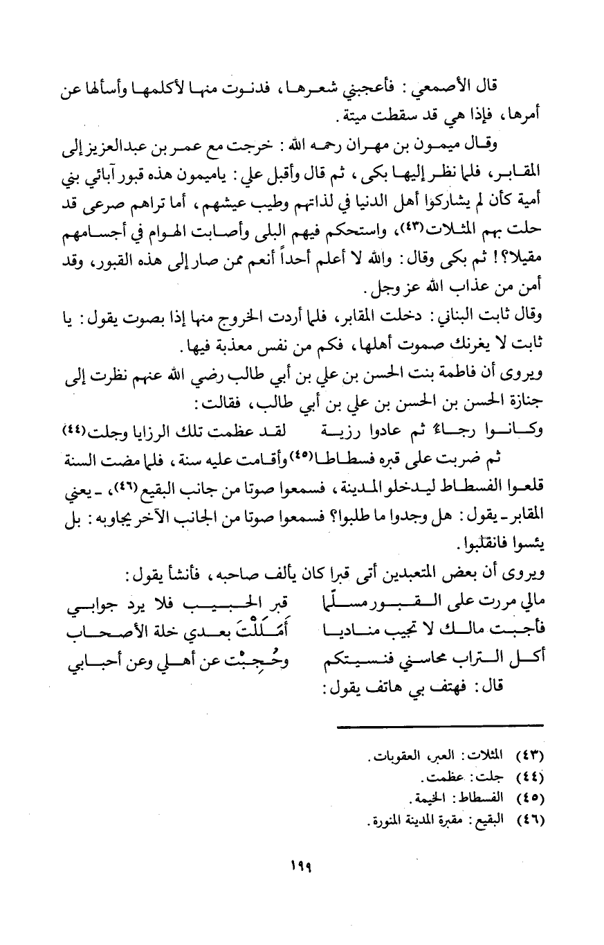 وَقَالَ مَيْمُون بن مهْرَان رَحمَه الله خرجت مَعَ عمر بن عبد الْعَزِيز إِلَى الْمَقَابِر فَلَمَّا نظر إِلَيْهَا بَكَى ثمَّ قَالَ وَأَقْبل عَليّ يَا مَيْمُون هَذِه قُبُور آبَائِي بني أُميَّة كَأَن لم يشاركوا أهل الدُّنْيَا فِي لذاتهم وَطيب عيشهم أما تراهم صرعى قد حلت بهم المثلات واستحكم فيهم البلى وأصابت الْهَوَام فِي أجسامهم مقيلا ثمَّ بَكَى وَقَالَ وَالله لَا أعلم أحدا أنعم مِمَّن صَار إِلَى هَذِه الْقُبُور وَقد أَمن من عَذَاب الله عز وَجل وَقَالَ ثَابت الْبنانِيّ دخلت الْمَقَابِر فَلَمَّا أردْت الْخُرُوج مِنْهَا إِذا بِصَوْت يَقُول يَا ثَابت لَا يغرنك صموت أَهلهَا فكم من نفس معذبة فِيهَا