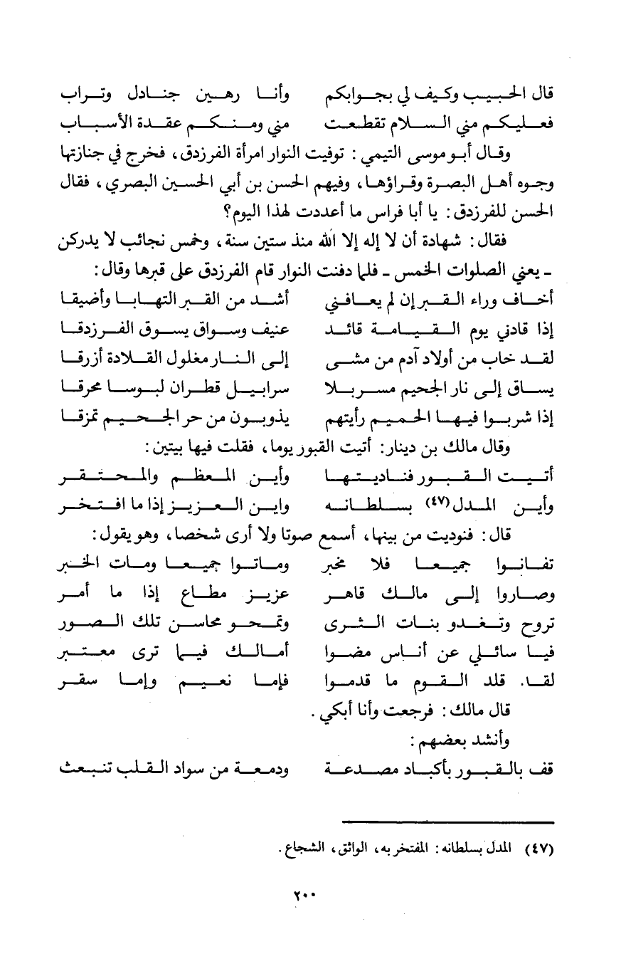 فَقَالَ شَهَادَة أَن لَا إِلَه إِلَّا الله مُنْذُ سِتِّينَ سنة وَخمْس نَجَائِب لَا يدركن يَعْنِي الصَّلَوَات الْخمس فَلَمَّا دفنت النوار قَامَ الفرزدق على قبرها وَقَالَ