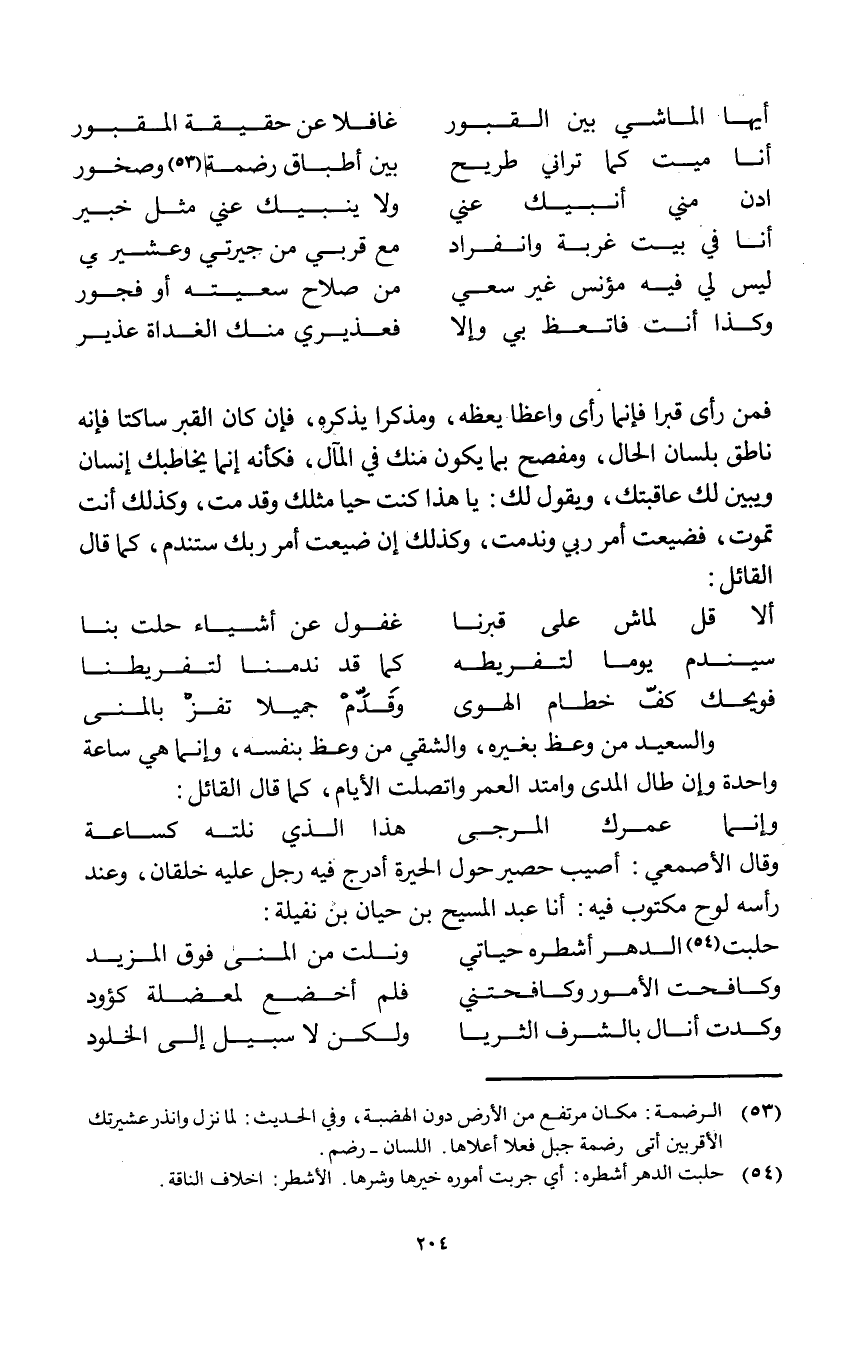 فَمن رأى قبرا فَإِنَّمَا رأى واعظا يعظه ومذكرا يذكرهُ فَإِن كَانَ الْقَبْر ساكتا فَإِنَّهُ نَاطِق بِلِسَان الْحَال ومفصح بِمَا يكون مِنْك فِي الْمَآل فَكَأَنَّهُ إِنَّمَا يخاطبك إِنْسَان وَيبين لَك عاقبتك وَيَقُول لَك يَا هَذَا كنت حَيا مثلك وَقد مت وَكَذَلِكَ أَنْت تَمُوت فضيعت أَمر رَبِّي وندمت وَكَذَلِكَ إِن ضيعت أَمر رَبك ستندم كَمَا قَالَ الْقَائِل