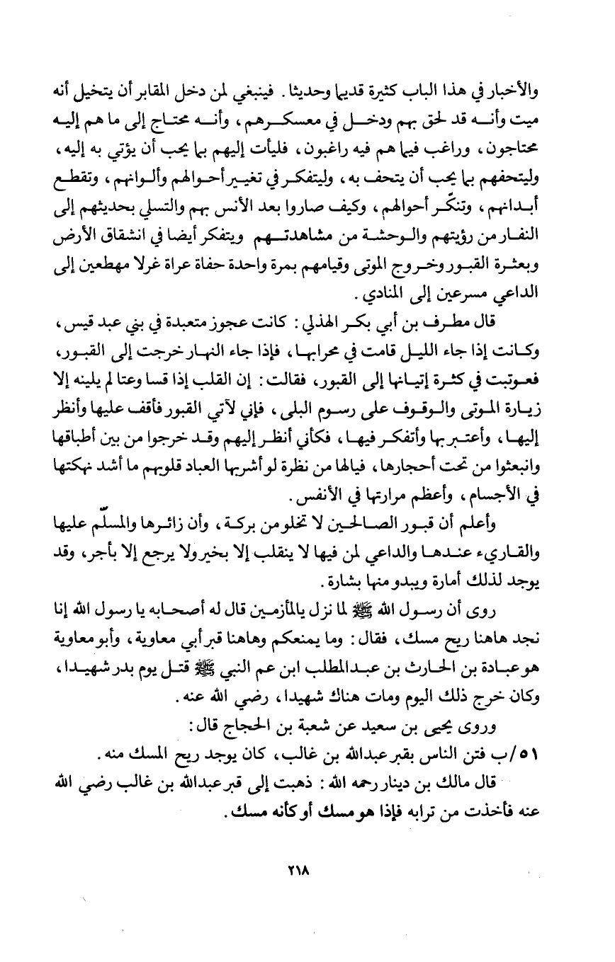 وَأعلم أَن قُبُور الصَّالِحين لَا تَخْلُو من بركَة وَأَن زائرها وَالْمُسلم عَلَيْهَا والقاريء عِنْدهَا والداعي لمن فِيهَا لَا يَنْقَلِب إِلَّا بِخَير وَلَا يرجع إِلَّا بِأَجْر وَقد يُوجد لذَلِك أَمارَة ويبدو مِنْهَا بِشَارَة