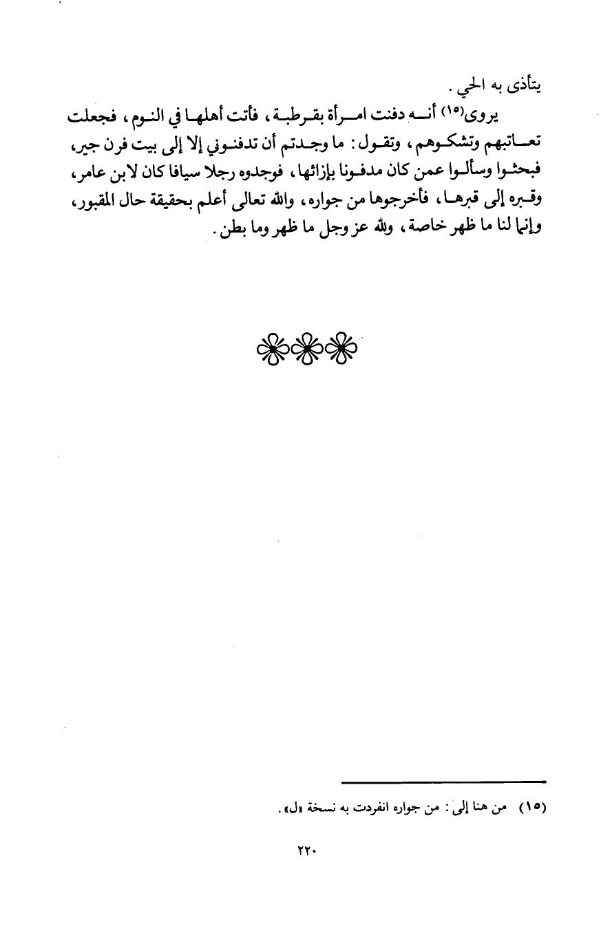 يرْوى أَنه دفنت امْرَأَة بقرطبة فَأَتَت أَهلهَا فِي النّوم فَجعلت تعاتبهم وتشكوهم وَتقول مَا وجدْتُم أَن تدفنوني إِلَّا إِلَى بَيت فرن جير فَبَحَثُوا وسألوا عَمَّن كَانَ مَدْفُونا بإزائها فوجدوه رجلا سيافا كَانَ لِابْنِ عَامر وقبره إِلَى قبرها فأخرجوها من جواره وَالله تَعَالَى أعلم بِحَقِيقَة حَال المقبور وَإِنَّمَا لنا مَا ظهر خَاصَّة وَللَّه عز وَجل مَا ظهر وَمَا بطن