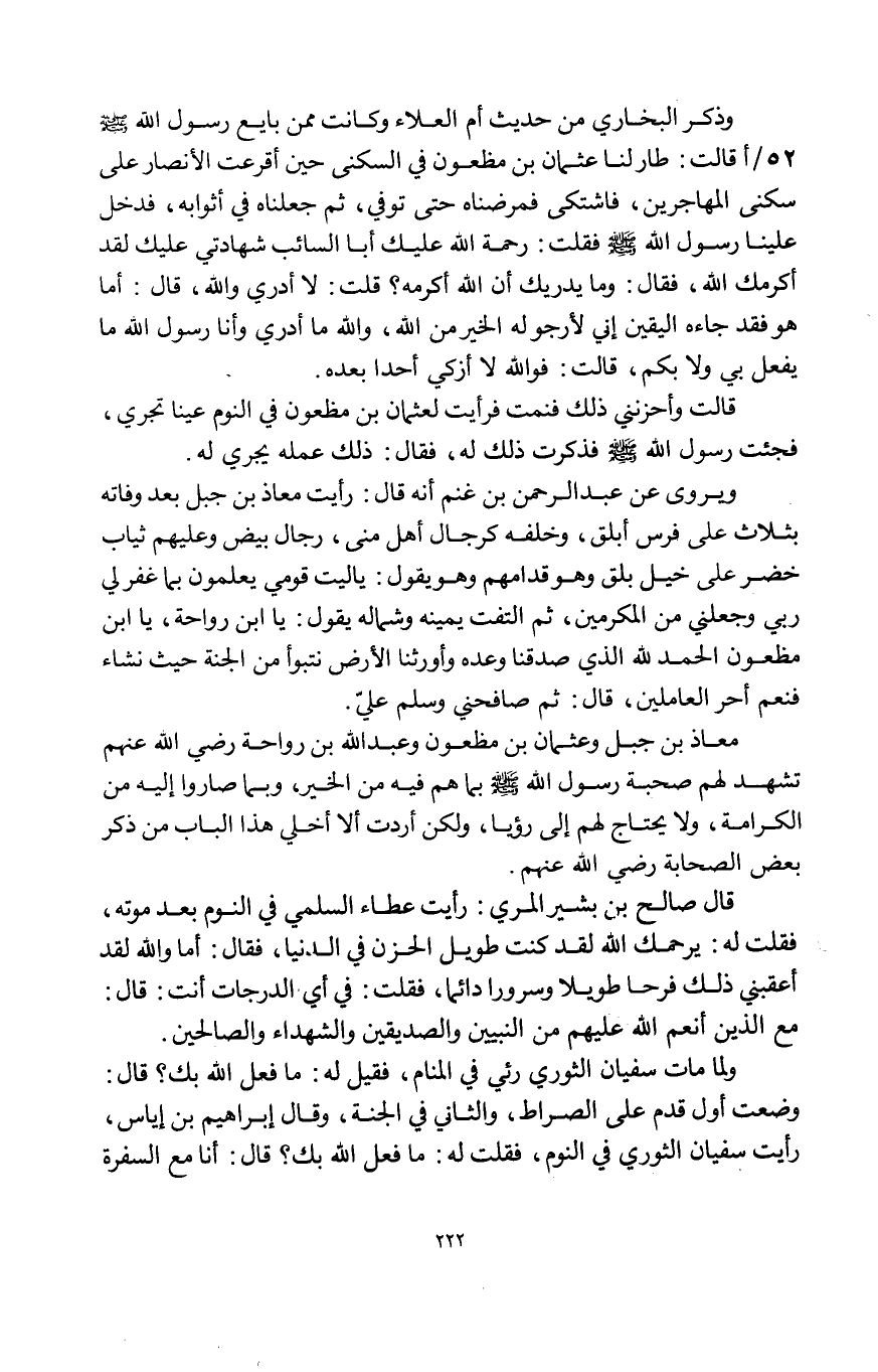 معَاذ بن جبل وَعُثْمَان بن مَظْعُون وَعبد الله بن رَوَاحَة رَضِي الله عَنْهُم تشهد لَهُم صُحْبَة رَسُول الله صلى الله عَلَيْهِ وَسلم بِمَا هم فِيهِ من الْخَيْر وَبِمَا صَارُوا إِلَيْهِ من الْكَرَامَة وَلَا يحْتَاج لَهُم إِلَى رُؤْيا وَلَكِن أردْت أَلا أخلي هَذَا الْبَاب من ذكر بعض الصَّحَابَة رَضِي الله عَنْهُم