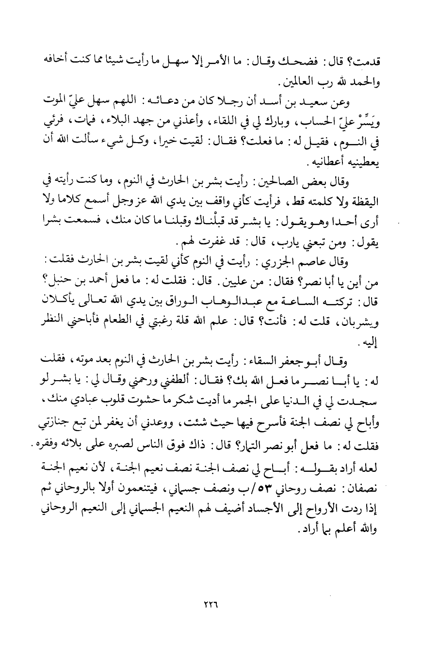 وَقَالَ أَبُو جَعْفَر السقاء رَأَيْت بشر بن الْحَارِث فِي النّوم بعد مَوته فَقلت لَهُ يَا أَبَا نصر مَا فعل الله بك فَقَالَ ألطفني ورحمني وَقَالَ لي يَا بشر لَو سجدت لي فِي الدُّنْيَا على الْجَمْر مَا أدّيت شكر مَا حشوت قُلُوب عبَادي مِنْك وأباح لي نصف الْجنَّة فأسرح فِيهَا حَيْثُ شِئْت ووعدني أَن يغْفر لمن تبع جنازتي فَقلت لَهُ مَا فعل أَبُو نصر التمار قَالَ ذَاك فَوق النَّاس لِصَبْرِهِ على بلائه وَفَقره لَعَلَّه أَرَادَ بقوله أَبَاحَ لي نصف الْجنَّة نصف نعيم الْجنَّة لِأَن نعيم الْجنَّة نِصْفَانِ نصف روحاني وَنصف جسماني فيتنعمون أَولا بالروحاني ثمَّ إِذا ردَّتْ الْأَرْوَاح إِلَى الأجساد أضيف لَهُم النَّعيم الجسماني إِلَى النَّعيم الروحاني وَالله أعلم بِمَا أَرَادَ