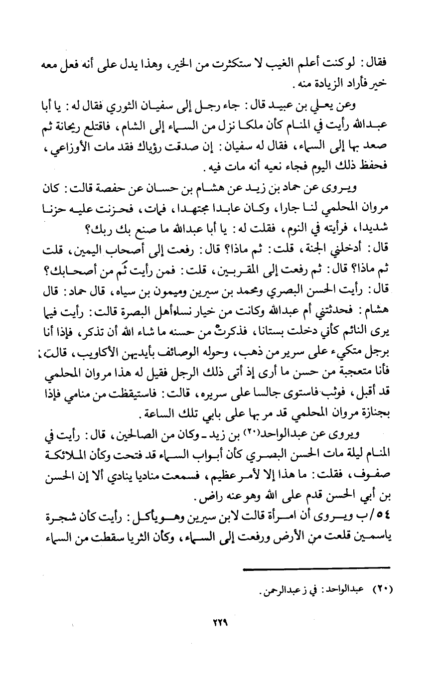 ويروى عَن عبد الْوَاحِد بن زيد وَكَانَ من الصَّالِحين قَالَ رَأَيْت فِي الْمَنَام لَيْلَة مَاتَ الْحسن الْبَصْرِيّ كَأَن أَبْوَاب السَّمَاء قد فتحت وَكَأن الْمَلَائِكَة صُفُوف فَقلت مَا هَذَا إِلَّا لأمر عَظِيم فَسمِعت مناديا يُنَادي أَلا إِن الْحسن بن أبي الْحسن قدم على الله وَهُوَ عَنهُ رَاض