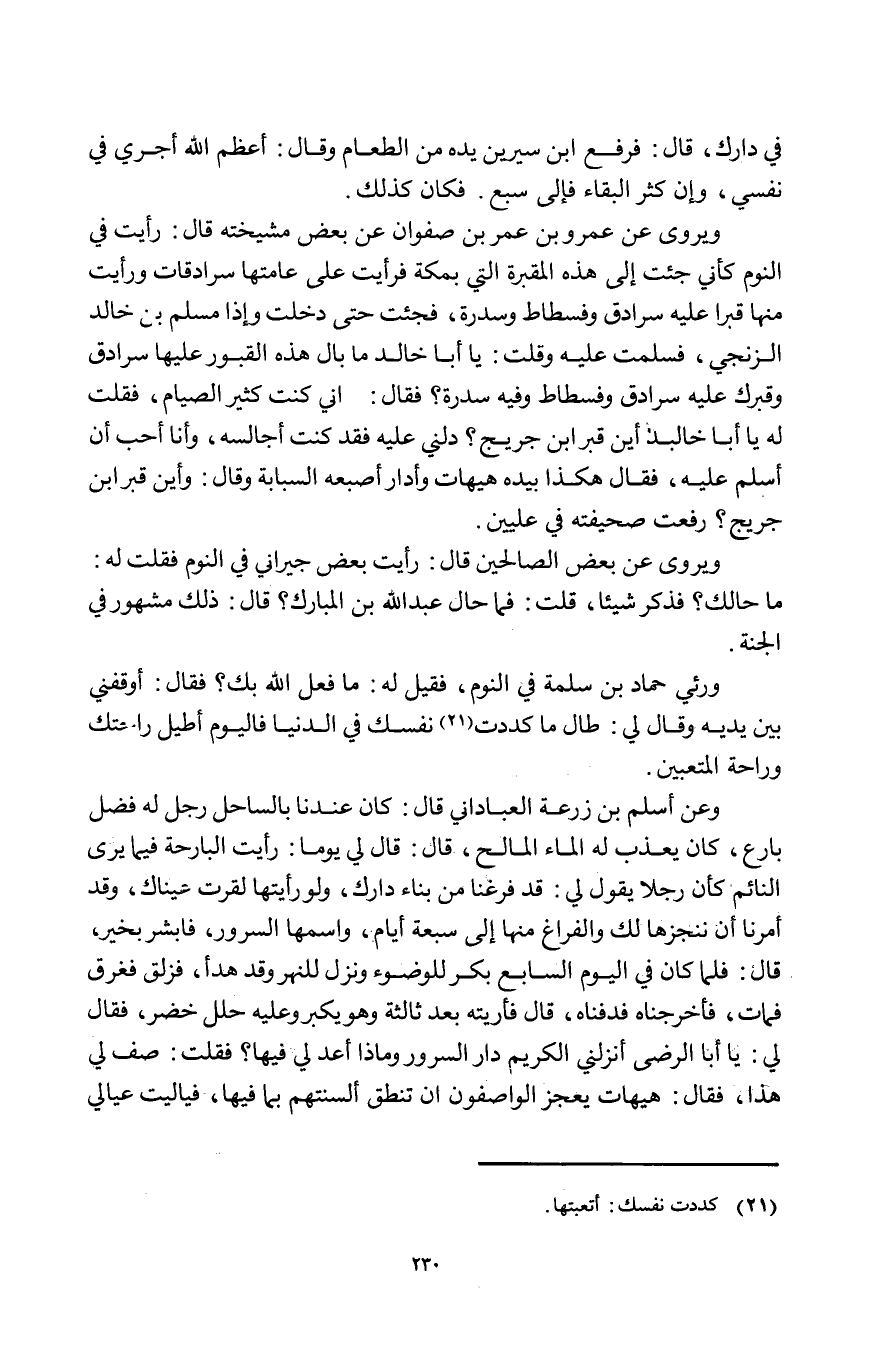 ورئي حَمَّاد بن سَلمَة فِي النّوم فَقيل لَهُ مَا فعل الله بك فَقَالَ أوقفني بَين يَدَيْهِ وَقَالَ لي طَال مَا كددت نَفسك فِي الدُّنْيَا فاليوم أطيل راحتك وراحة المتعبين