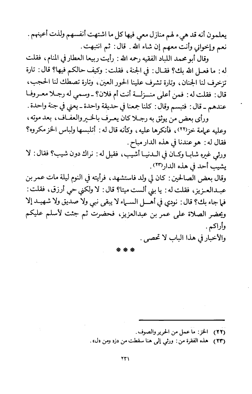 وَرَأى بعض من يوثق بِهِ رجلا كَانَ يعرف بِالْخَيرِ والعفاف بعد مَوته وَعَلِيهِ عِمَامَة خَز فأنكرها عَلَيْهِ وَكَأَنَّهُ قَالَ لَهُ أتلبسها ولباس الْخَزّ مَكْرُوه فَقَالَ لَهُ هُوَ عندنَا فِي هَذِه الدَّار مُبَاح