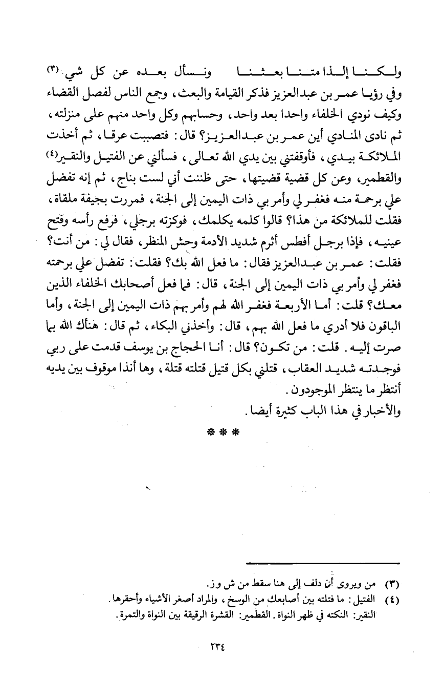 وَفِي رُؤْيا عمر بن عبد الْعَزِيز فَذكر الْقِيَامَة والبعث وَجمع النَّاس لفصل الْقَضَاء وَكَيف نُودي الْخُلَفَاء وَاحِدًا بعد وَاحِد وحسابهم وكل وَاحِد مِنْهُم على مَنْزِلَته ثمَّ نَادَى الْمُنَادِي أَيْن عمر بن عبد الْعَزِيز قَالَ فتصببت عرقا ثمَّ أخذت الْمَلَائِكَة بيَدي فأوقفتني بَين يَدي الله تَعَالَى فَسَأَلَنِي عَن الفتيل والنقير والقطمير وَعَن كل قَضِيَّة قضيتها حَتَّى ظَنَنْت أَنِّي لست بناج ثمَّ إِنَّه تفضل عَليّ برحمة مِنْهُ فغفر لي وَأمر بِي ذَات الْيَمين إِلَى الْجنَّة فمررت بجيفة ملقاة فَقلت للْمَلَائكَة من هَذَا قَالُوا كَلمه يكلمك فوكزته برجلي فَرفع رَأسه وَفتح عَيْنَيْهِ فَإِذا بِرَجُل أفطس أثرم شَدِيد الأدمة وَحش المنظر فَقَالَ لي من أَنْت فَقلت عمر بن عبد الْعَزِيز فَقَالَ مَا فعل الله بك فَقلت تفضل عَليّ برحمته فغفر لي وَأمر بِي ذَات الْيَمين إِلَى الْجنَّة قَالَ فَمَا فعل أَصْحَابك الْخُلَفَاء الَّذين مَعَك قلت أما الْأَرْبَعَة فغفر الله لَهُم وَأمر بهم ذَات الْيَمين إِلَى الْجنَّة وَأما الْبَاقُونَ فَلَا أَدْرِي مَا فعل الله بهم قَالَ وأخذني الْبكاء ثمَّ قَالَ هَنَّأَك الله بِمَا صرت إِلَيْهِ قلت من تكون قَالَ أَنا الْحجَّاج بن يُوسُف قدمت على رَبِّي فَوَجَدته شَدِيد الْعقَاب قتلني بِكُل قَتِيل قتلته قتلة وَهَا أنذا مَوْقُوف بَين يَدَيْهِ أنْتَظر مَا ينْتَظر الموجودون