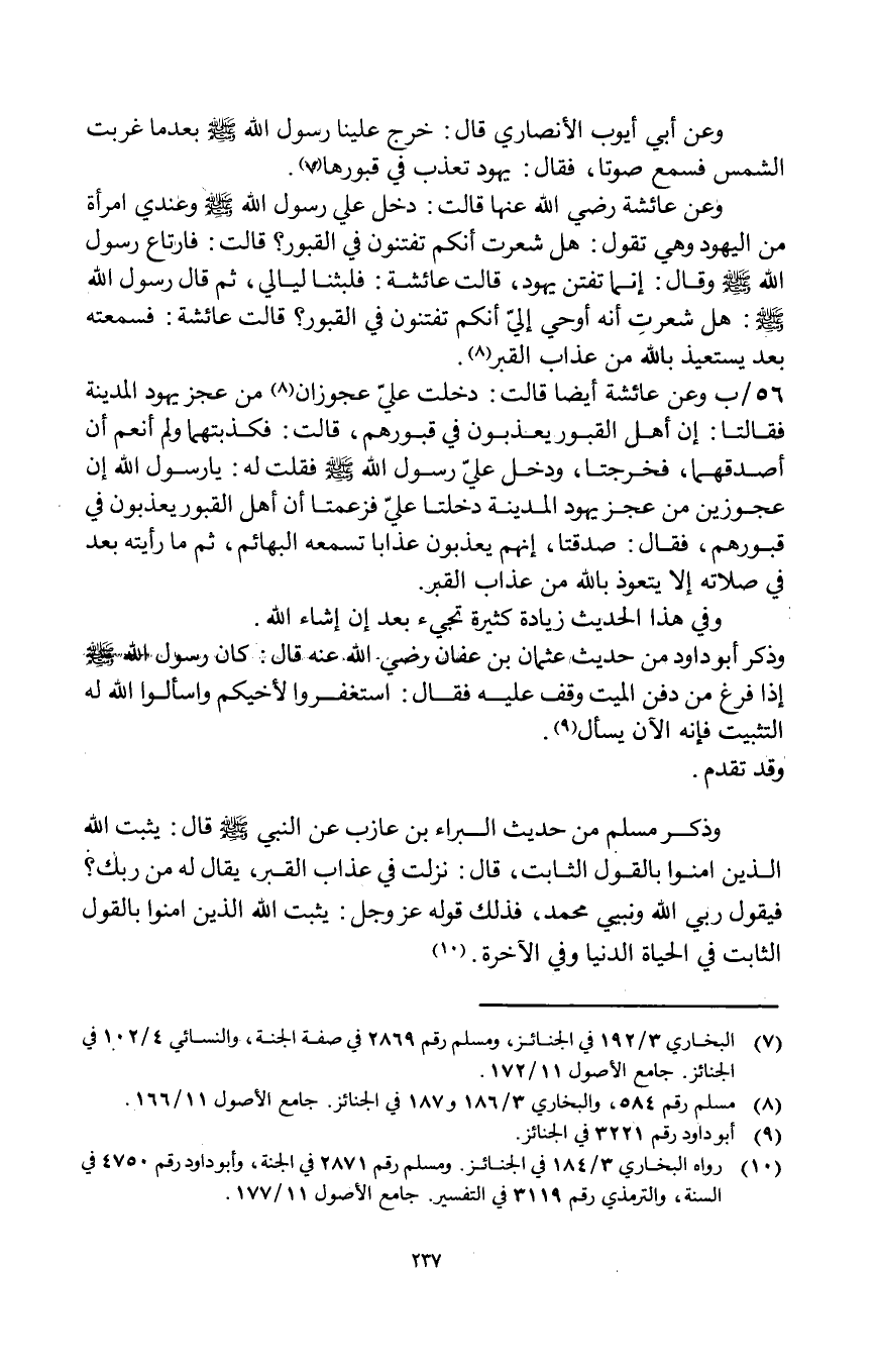 وَعَن عَائِشَة رَضِي الله عَنْهَا قَالَت دخل عَليّ رَسُول الله صلى الله عَلَيْهِ وَسلم وَعِنْدِي امْرَأَة من الْيَهُود وَهِي تَقول هَل شَعرت أَنكُمْ تفتنون فِي الْقُبُور قَالَت فارتاع رَسُول الله صلى الله عَلَيْهِ وَسلم وَقَالَ إِنَّمَا تفتن يهود قَالَت عَائِشَة فلبثنا ليَالِي ثمَّ قَالَ رَسُول الله صلى الله عَلَيْهِ وَسلم هَل شَعرت أَنه أُوحِي إِلَيّ أَنكُمْ تفتنون فِي الْقُبُور قَالَت عَائِشَة فَسَمعته بعد يستعيذ بِاللَّه من عَذَاب الْقَبْر