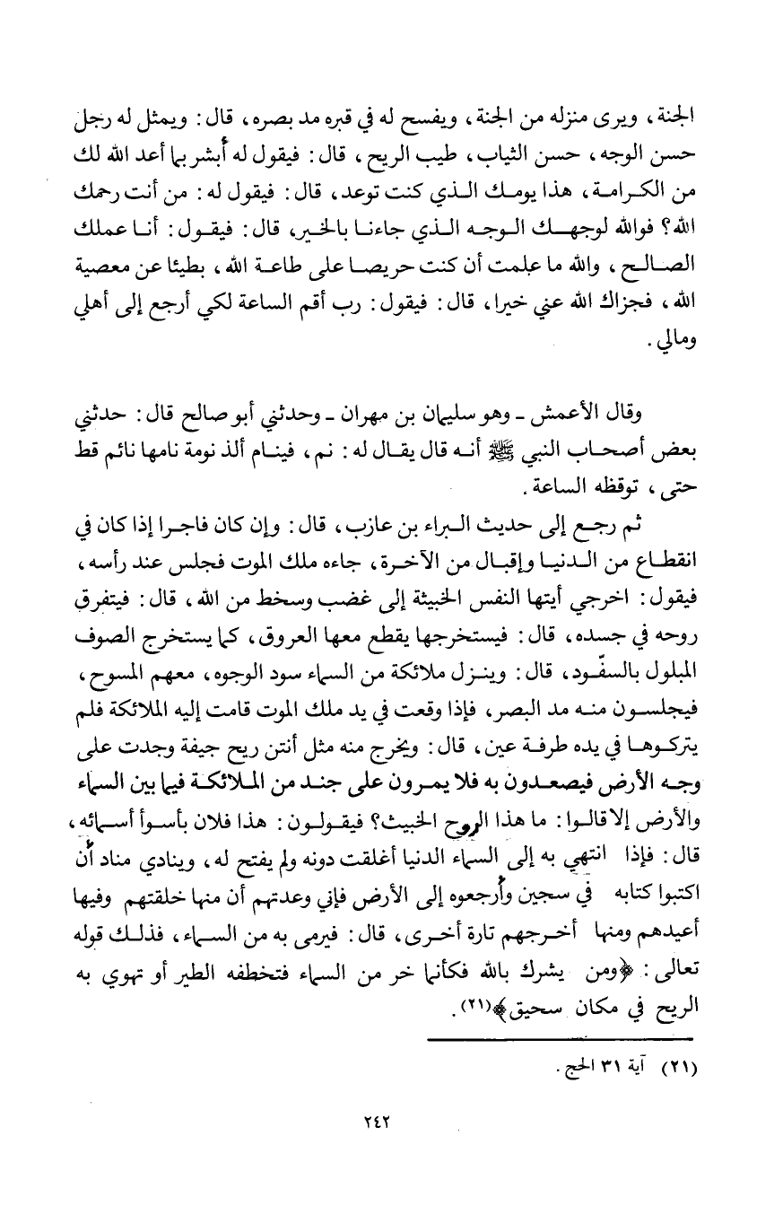 ثمَّ رَجَعَ إِلَى حَدِيث الْبَراء بن عَازِب قَالَ وَإِن كَانَ فَاجِرًا إِذا كَانَ فِي انْقِطَاع من الدُّنْيَا وإقبال من الْآخِرَة جَاءَهُ ملك الْمَوْت فَجَلَسَ عِنْد رَأسه فَيَقُول اخْرُجِي أيتها النَّفس الخبيثة إِلَى غضب وَسخط من الله قَالَ فَيَتَفَرَّق روحه فِي جسده قَالَ فيستخرجها يقطع مَعهَا الْعُرُوق كَمَا يسْتَخْرج الصُّوف المبلول بالسفود قَالَ وَينزل مَلَائِكَة من السَّمَاء سود الْوُجُوه مَعَهم المسوح فَيَجْلِسُونَ مِنْهُ مد الْبَصَر فَإِذا وَقعت فِي يَد ملك الْمَوْت قَامَت إِلَيْهِ الْمَلَائِكَة فَلم يتركوها فِي يَده طرفَة عين قَالَ وَيخرج مِنْهُ مثل أنتن ريح جيفة وجدت على وَجه الأَرْض فيصعدون بِهِ فَلَا يَمرونَ على جند من الْمَلَائِكَة فِيمَا بَين السَّمَاء وَالْأَرْض إِلَّا قَالُوا مَا هَذَا الرّوح الْخَبيث فَيَقُولُونَ هَذَا فلَان بِأَسْوَأ أَسْمَائِهِ قَالَ فَإِذا انتهي بِهِ إِلَى السَّمَاء الدُّنْيَا أغلقت دونه وَلم يفتح لَهُ وينادي مُنَاد أَن اكتبوا كِتَابه فِي سِجِّين وأرجعوه إِلَى الأَرْض فَإِنِّي وعدتهم أَن مِنْهَا خلقتهمْ وفيهَا أعيدهم وَمِنْهَا أخرجهم تَارَة أُخْرَى قَالَ فَيرمى بِهِ من السَّمَاء فَذَلِك قَوْله تَعَالَى وَمن يُشْرك بِاللَّه فَكَأَنَّمَا خر من السَّمَاء فتخطفه الطير أَو تهوي بِهِ الرّيح فِي مَكَان سحيق