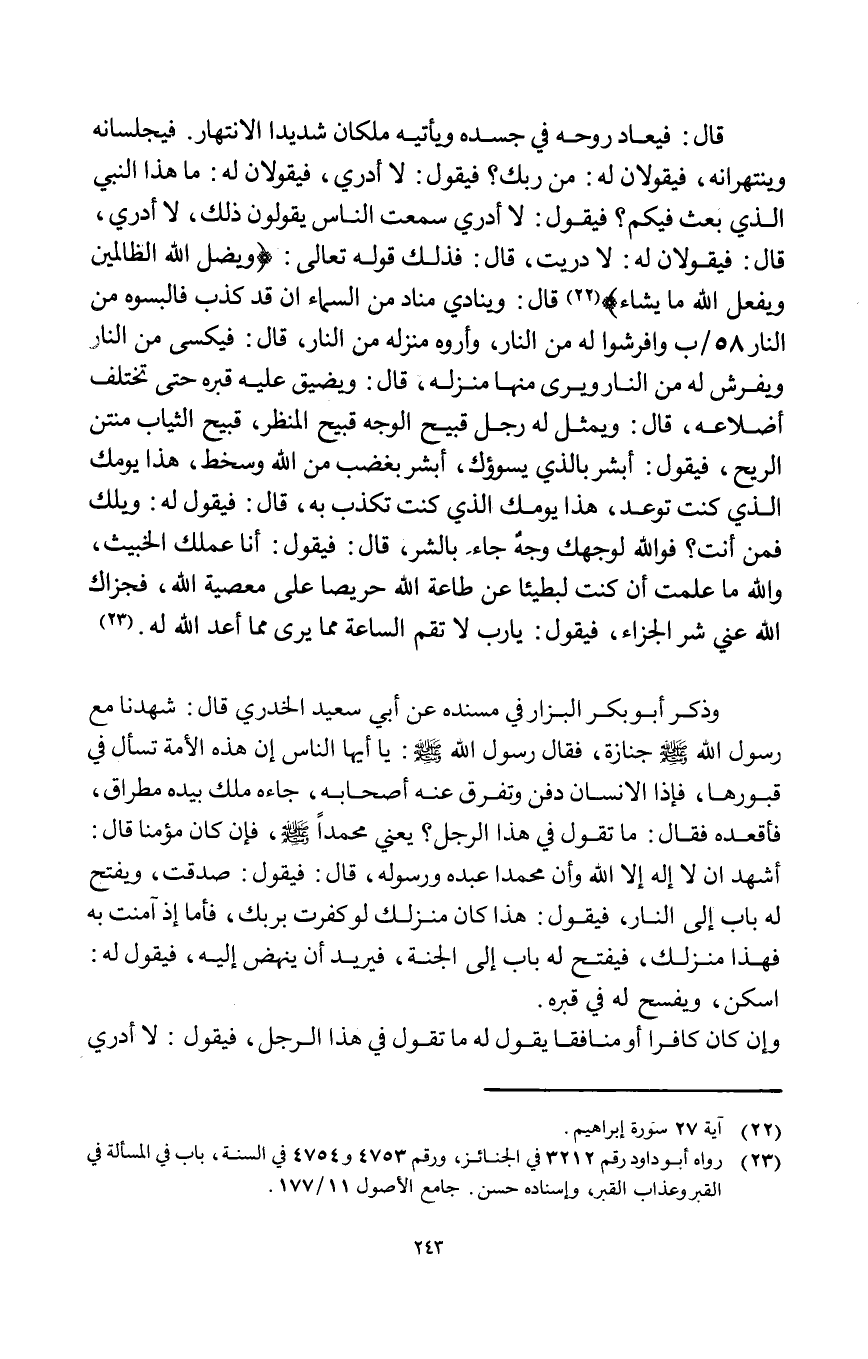 وَذكر أَبُو بكر الْبَزَّار فِي مُسْنده عَن أبي سعيد الْخُدْرِيّ قَالَ شَهِدنَا مَعَ رَسُول الله صلى الله عَلَيْهِ وَسلم جَنَازَة فَقَالَ رَسُول الله صلى الله عَلَيْهِ وَسلم يَا أَيهَا النَّاس إِن هَذِه الْأمة تسْأَل فِي قبورها فَإِذا الْإِنْسَان دفن وتفرق عَنهُ أَصْحَابه جَاءَهُ ملك بِيَدِهِ مطراق فأقعده فَقَالَ مَا تَقول فِي هَذَا الرجل يَعْنِي مُحَمَّدًا صلى الله عَلَيْهِ وَسلم فَإِن كَانَ مُؤمنا قَالَ أشهد أَن لَا إِلَه إِلَّا الله وَأَن مُحَمَّدًا عَبده وَرَسُوله قَالَ فَيَقُول صدقت وَيفتح لَهُ بَاب إِلَى النَّار فَيَقُول هَذَا كَانَ مَنْزِلك لَو كفرت بِرَبِّك فَأَما إِذا آمَنت بِهِ فَهَذَا مَنْزِلك فَيفتح لَهُ بَاب إِلَى الْجنَّة فيريد أَن ينْهض إِلَيْهِ فَيَقُول لَهُ اسكن ويفسح لَهُ فِي قَبره