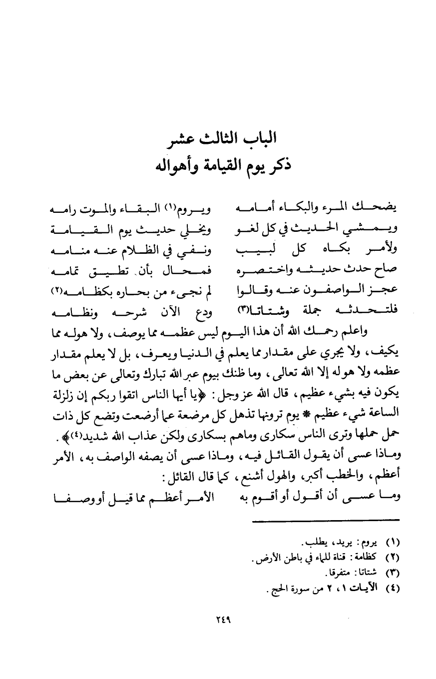 وَاعْلَم رَحِمك الله أَن هَذَا الْيَوْم لَيْسَ عظمه مِمَّا يُوصف وَلَا هوله مِمَّا يكيف وَلَا يجْرِي على مِقْدَار مِمَّا يعلم فِي الدُّنْيَا وَيعرف بل لَا يعلم مِقْدَار عظمه وَلَا هُوَ لَهُ إِلَّا الله تَعَالَى وَمَا ظَنك بِيَوْم عبر الله تبَارك وَتَعَالَى عَن بعض مَا يكون فِيهِ بِشَيْء عَظِيم قَالَ الله عز وَجل يَا أَيهَا النَّاس اتَّقوا ربكُم إِن زَلْزَلَة السَّاعَة شَيْء عَظِيم يَوْم ترونها تذهل كل مُرْضِعَة عَمَّا أرضعت وتضع كل ذَات حمل حملهَا وَترى النَّاس سكارى وَمَا هم بسكارى وَلَكِن عَذَاب الله شَدِيد وماذا عَسى أَن يَقُول الْقَائِل فِيهِ وماذا عَسى أَن يصفه الواصف بِهِ الْأَمر أعظم والخطب أكبر والهول أشنع كَمَا قَالَ الْقَائِل