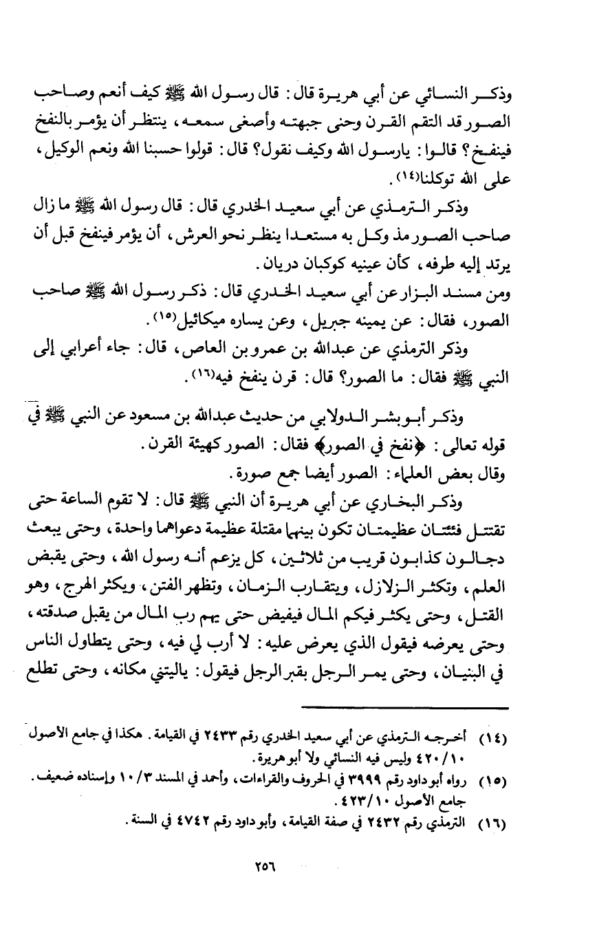 وَذكر النَّسَائِيّ عَن أبي هُرَيْرَة قَالَ قَالَ رَسُول الله صلى الله عَلَيْهِ وَسلم كَيفَ أنعم وَصَاحب الصُّور قد الْتَقم الْقرن وحنى جَبهته وأصغى سَمعه ينْتَظر أَن يُؤمر بالنفخ فينفخ قَالُوا يَا رَسُول الله وَكَيف نقُول قَالَ قُولُوا حَسبنَا الله وَنعم الْوَكِيل على الله توكلنا