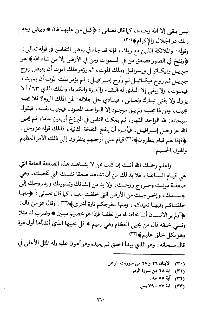 وَاعْلَم رَحِمك الله أَنَّك إِن كنت مِمَّن لَا يُشَاهد هَذِه الصعقة الْعَامَّة الَّتِي هِيَ قيام السَّاعَة فَلَا بُد لَك من أَن تشاهد صعقة نَفسك الَّتِي تخصك وَهِي صعقة موتك وَخُرُوج روحك وَلَا بُد من إنشائك وتسويتك ورد روحك إِلَى جسدك وإخراجك من الأَرْض الَّتِي خلقت مِنْهَا كَمَا قَالَ تَعَالَى مِنْهَا خَلَقْنَاكُمْ وفيهَا نعيدكم وَمِنْهَا نخرجكم تَارَة أُخْرَى وَقَالَ عز من قَالَ أولم ير الْإِنْسَان أَنا خلقناه من نُطْفَة فَإِذا هُوَ خصيم مُبين وَضرب لنا مثلا وَنسي خلقه قَالَ من يحيي الْعِظَام وَهِي رَمِيم قل يُحْيِيهَا الَّذِي أَنْشَأَهَا أول مرّة وَهُوَ بِكُل خلق عليم