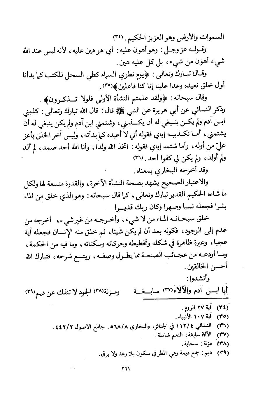 وَقَالَ سُبْحَانَهُ وَلَقَد علمْتُم النشأة الأولى فلولا تذكرُونَ وَذكر النَّسَائِيّ عَن أبي هُرَيْرَة عَن النَّبِي صلى الله عَلَيْهِ وَسلم قَالَ قَالَ الله تبَارك وَتَعَالَى كَذبَنِي ابْن آدم وَلم يكن يَنْبَغِي لَهُ أَن يكذبنِي وشمتني ابْن آدم وَلم يكن يَنْبَغِي لَهُ أَن يَشْتمنِي أما تَكْذِيبه إيَّايَ فَقَوله أَنِّي لَا أُعِيدهُ كَمَا بَدأته وَلَيْسَ آخر الْخلق بِأَعَز عَليّ من أَوله وَأما شَتمه إيَّايَ فَقَوله اتخذ الله ولدا وَأَنا الله أحد صَمد لم أَلد وَلم أولد وَلم يكن لي كفوا أحد