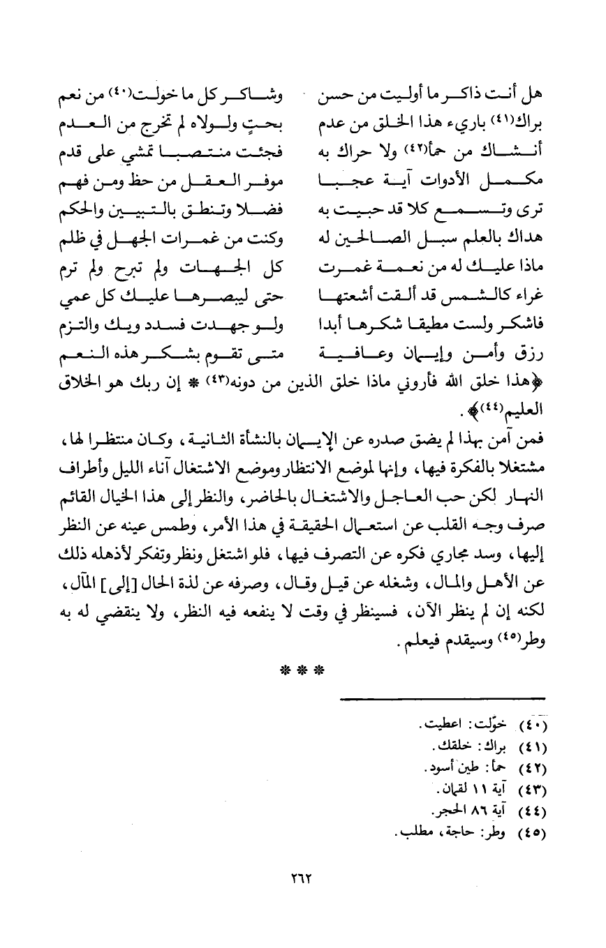 فَمن آمن بِهَذَا لم يضق صَدره عَن الْإِيمَان بالنشأة الثَّانِيَة وَكَانَ منتظرا لَهَا مشتغلا بالفكرة فِيهَا وَإِنَّهَا لموْضِع الِانْتِظَار وَمَوْضِع الِاشْتِغَال آنَاء اللَّيْل وأطراف النَّهَار لَكِن حب العاجل والاشتغال بالحاضر وَالنَّظَر إِلَى هَذَا الخيال الْقَائِم صرف وَجه الْقلب عَن اسْتِعْمَال الْحَقِيقَة فِي هَذَا الْأَمر وطمس عينه عَن النّظر إِلَيْهَا وسد مجاري فكره عَن التَّصَرُّف فِيهَا فَلَو اشْتغل وَنظر وتفكر لأذهله ذَلِك عَن الْأَهْل وَالْمَال وشغله عَن قيل وَقَالَ وَصَرفه عَن لَذَّة الْحَال إِلَى الْمَآل لكنه إِن لم ينظر الْآن فسينظر فِي وَقت لَا يَنْفَعهُ فِيهِ النّظر وَلَا يَنْقَضِي لَهُ بِهِ وطر وسيقدم فَيعلم