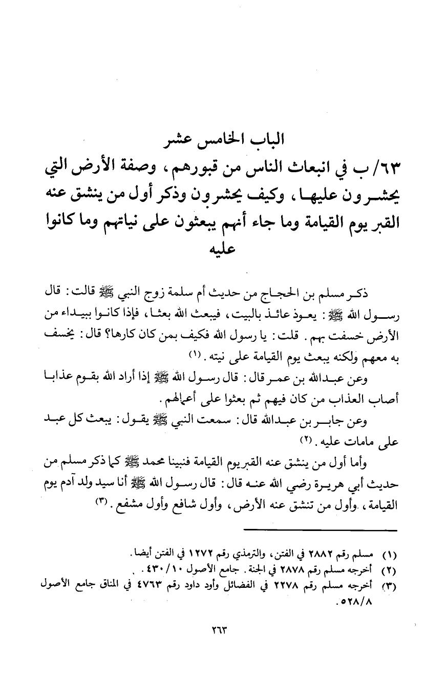 الْبَاب الْخَامِس عشر فِي انبعاث النَّاس من قُبُورهم وَصفَة الأَرْض الَّتِي يحشرون عَلَيْهَا وَكَيف يحشرون وَذكر أول من ينشق عَنهُ الْقَبْر يَوْم الْقِيَامَة وَمَا جَاءَ أَنهم يبعثون على نياتهم وَمَا كَانُوا عَلَيْهِ