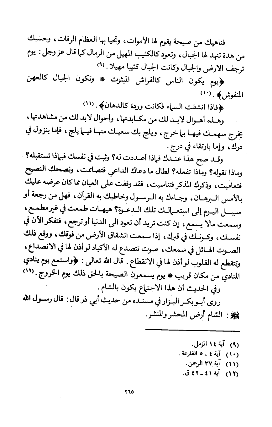 فناهيك من صَيْحَة يقوم لَهَا الاموات وتحيا بهَا الْعِظَام الرفات وحسبك من هدة تنهد لَهَا الْجبَال وتعود كالكثيب المهيل من الرمال كَمَا قَالَ عز وَجل {يَوْم ترجف الأَرْض وَالْجِبَال وَكَانَت الْجبَال كثيبا مهيلا} {يَوْم يكون النَّاس كالفراش المبثوث وَتَكون الْجبَال كالعهن المنفوش}
