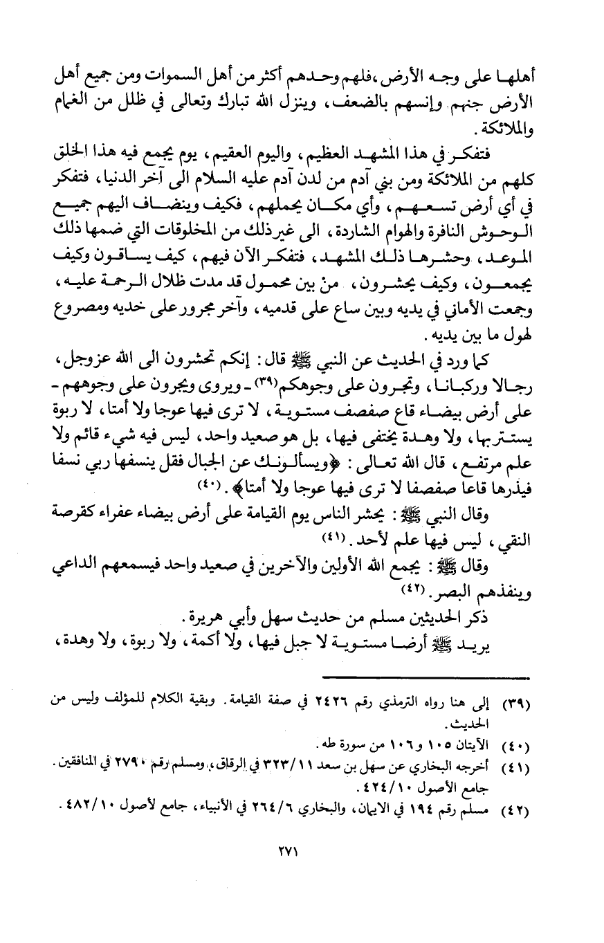 كَمَا ورد فِي الحَدِيث عَن النَّبِي صلى الله عَلَيْهِ وَسلم قَالَ إِنَّكُم تحشرون إِلَى الله عز وَجل رجَالًا وركبانا وَتجرونَ على وُجُوهكُم ويروى ويجرون على وُجُوههم على أَرض بَيْضَاء قاع صفصف مستوية لَا ترى فِيهَا عوجا وَلَا أمتا لَا ربوة يسْتَتر بهَا وَلَا وهدة يختفى فِيهَا بل هُوَ صَعِيد وَاحِد لَيْسَ فِيهِ شَيْء قَائِم وَلَا علم مُرْتَفع قَالَ الله تَعَالَى {ويسألونك عَن الْجبَال فَقل ينسفها رَبِّي نسفا فيذرها قاعا صفصفا لَا ترى فِيهَا عوجا وَلَا أمتا}