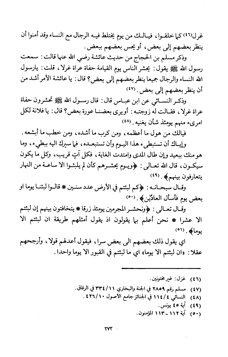 وَذكر النَّسَائِيّ عَن ابْن عَبَّاس قَالَ قَالَ رَسُول الله صلى الله عَلَيْهِ وَسلم تحشرون حُفَاة عُرَاة غرلًا فَقَالَت لَهُ زَوجته أَو يرى بَعْضنَا عَورَة بعض قَالَ يَا فُلَانَة لكل امرىء مِنْهُم يَوْمئِذٍ شَأْن يُغْنِيه