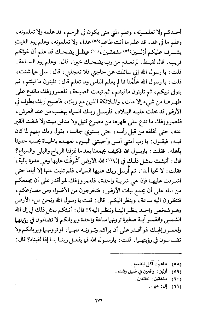 أحدكُم وَلَا تعلمونه وَعلم الْمَنِيّ مَتى يكون فِي الرَّحِم قد علمه وَلَا تعلمونه وَعلم مَا فِي غَد قد علم مَا أَنْت طاعم غَدا وَلَا تعلمونه وَعلم يَوْم الْغَيْث يشرف عَلَيْكُم أزلين مشفقين فيظل يضْحك قد علم أَن غوثكم قريب قَالَ لَقِيط لم نعدم من رب يضْحك خيرا قَالَ وَعلم يَوْم السعَة قلت يَا رَسُول الله إِنِّي سَائِلك عَن حَاجَتي فَلَا تعجلني قَالَ سل عَمَّا شِئْت قلت يَا رَسُول الله علمنَا مِمَّا لم يعلم النَّاس وَمَا تعلم قَالَ تلبثون مَا لبثتم ثمَّ يتوفى نَبِيكُم ثمَّ تلبثون مَا لبثتم ثمَّ تبْعَث الصَّيْحَة فلعمرو إلهك مَا تدع على ظهرهَا من شَيْء إِلَّا مَاتَ وَالْمَلَائِكَة الَّذين مَعَ رَبك فَأصْبح رَبك يطوف فِي الأَرْض قد خلت عَلَيْهِ الْبِلَاد فَأرْسل رَبك السَّمَاء بهضب من عِنْد الْعَرْش فلعمرو إلهك مَا تدع على ظهرهَا من مصرع قَتِيل وَلَا مدفن ميت إِلَّا شقَّتْ الْقَبْر عَنهُ حَتَّى تخلقه من قبل رَأسه حَتَّى يَسْتَوِي جَالِسا يَقُول رَبك مَهيم لما كَانَ فِيهِ فَيَقُول يَا رب أمتني أمس وأحييتني الْيَوْم لعهده بِالْحَيَاةِ يحسبه حَدِيثا بأَهْله فَقلت يَا رَسُول الله فَكيف يجمعنا بعد مَا تمزقنا الرِّيَاح والبلى وَالسِّبَاع قَالَ أنبئك بِمثل ذَلِك فِي إل الله الأَرْض أشرفت عَلَيْهَا وَهِي مَدَرَة بالية فَقلت لَا تحيا أبدا ثمَّ أرسل رَبك عَلَيْهَا السَّمَاء فَلم تلبث عَنْهَا إِلَّا أَيَّامًا حَتَّى أشرفت عَلَيْهَا فَإِذا هِيَ شربة وَاحِدَة فلعمرو إلهك لَهو أقدر على أَن يجمعكم من المَاء على أَن يجمع نَبَات الأَرْض فتخرجون من الأضواء وَمن مصارعكم فتنظرون إِلَيْهِ سَاعَة وَينظر إِلَيْكُم قَالَ قلت يَا رَسُول الله وَنحن ملْء الأَرْض وَهُوَ شخص وَاحِد ينظر إِلَيْنَا وَنَنْظُر إِلَيْهِ قَالَ أنبئكم بِمثل ذَلِك فِي إل الله الشَّمْس وَالْقَمَر آيَة صَغِيرَة ترونهما سَاعَة وَاحِدَة ويريانكم لَا تضَامون فِي رُؤْيَتهمَا ولعمرو ألهك لَهو أقدر على أَن يراكم وترونه مِنْهُمَا أَو ترونهما ويريانكم وَلَا تضَامون فِي رُؤْيَتهمَا قلت يَا رَسُول الله فَمَا يفعل رَبنَا بِنَا إِذا لقيناه قَالَ