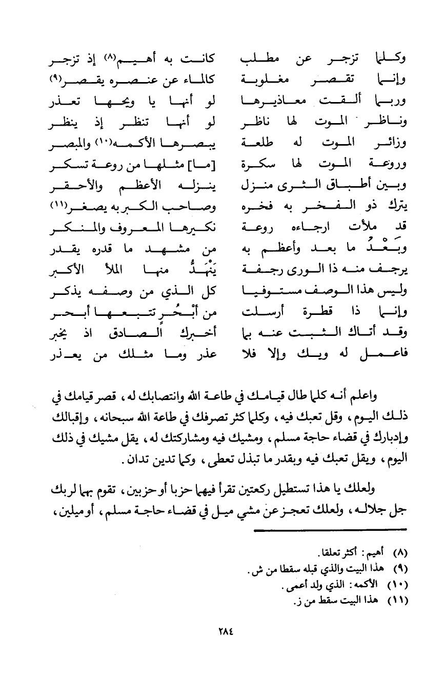 ولعلك يَا هَذَا تستطيل رَكْعَتَيْنِ تقْرَأ فيهمَا حزبا أَو حزبين تقوم بهما لِرَبِّك جلّ جَلَاله ولعلك تعجز عَن مشي ميل فِي قَضَاء حَاجَة مُسلم أَو ميلين