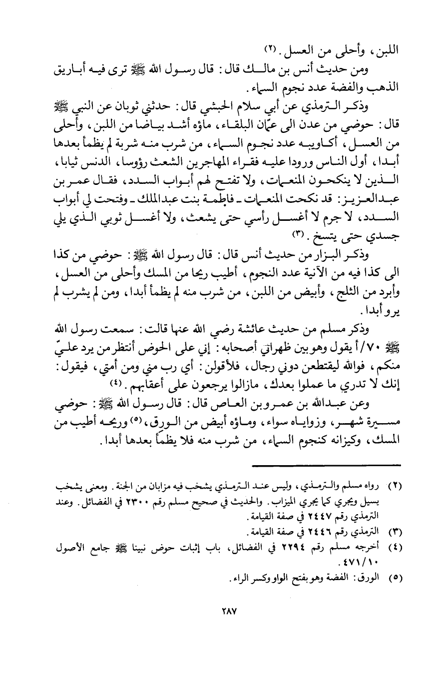 وَذكر التِّرْمِذِيّ عَن أبي سَلام الحبشي قَالَ حَدثنِي ثَوْبَان عَن النَّبِي صلى الله عَلَيْهِ وَسلم قَالَ حَوْضِي من عدن إِلَى عمان البلقاء مَاؤُهُ أَشد بَيَاضًا من اللَّبن وَأحلى من الْعَسَل أَكَاوِيبه عدد نُجُوم السَّمَاء من شرب مِنْهُ شربة لم يظمأ بعْدهَا أبدا أول النَّاس ورودا عَلَيْهِ فُقَرَاء الْمُهَاجِرين الشعث رؤوسا الدنس ثيابًا الَّذين لَا ينْكحُونَ الْمُنَعَّمَاتِ وَلَا تفتح لَهُم أَبْوَاب السدد فَقَالَ عمر بن عبد الْعَزِيز قد نكحت الْمُنَعَّمَاتِ فَاطِمَة بنت عبد الْملك وَفتحت لي أَبْوَاب السدد لَا جرم لَا إغسل رَأْسِي حَتَّى يشعث وَلَا أغسل ثوبي الَّذِي يَلِي جَسَدِي حَتَّى يتسخ