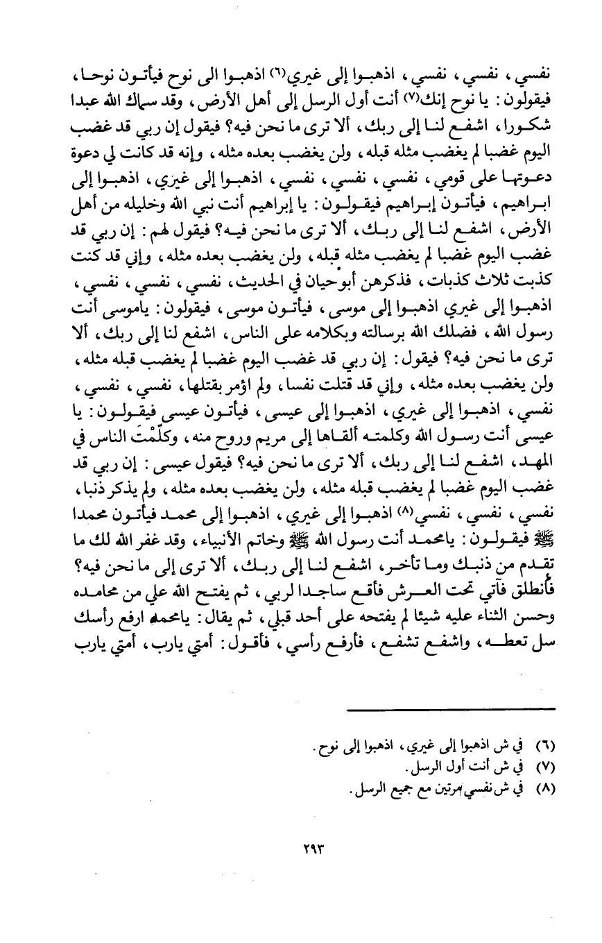 نَفسِي نَفسِي نَفسِي اذْهَبُوا إِلَى غَيْرِي اذْهَبُوا إِلَى نوح فَيَأْتُونَ نوحًا فَيَقُولُونَ يَا نوح إِنَّك أَنْت أول الرُّسُل إِلَى أهل الأَرْض وَقد سماك الله عبدا شكُورًا أشفع لنا إِلَى رَبك أَلا ترى مَا نَحن فِيهِ فَيَقُول إِن رَبِّي قد غضب الْيَوْم غَضبا لم يغْضب مثله قبله وَلنْ يغْضب بعده مثله وَإنَّهُ قد كَانَت لي دَعْوَة دعوتها على قومِي نَفسِي نَفسِي نَفسِي اذْهَبُوا إِلَى غَيْرِي اذْهَبُوا إِلَى إِبْرَاهِيم فَيَأْتُونَ إِبْرَاهِيم فَيَقُولُونَ يَا إِبْرَاهِيم أَنْت نَبِي الله وخليله من أهل الأَرْض اشفع لنا إِلَى رَبك الا ترى مَا نَحن فِيهِ فَيَقُول لَهُم إِن رَبِّي قد غضب الْيَوْم غَضبا لم يغْضب مثله قبله وَلنْ يغْضب بعده مثله وَإِنِّي قد كنت كذبت ثَلَاث كذبات فَذَكرهنَّ أَبُو حَيَّان فِي الحَدِيث نَفسِي نَفسِي نَفسِي اذْهَبُوا إِلَى غَيْرِي اذْهَبُوا إِلَى مُوسَى فَيَأْتُونَ مُوسَى فَيَقُولُونَ يَا مُوسَى أَنْت رَسُول الله فضلك الله برسالته وبكلامه على النَّاس اشفع لنا إِلَى رَبك أَلا ترى مَا نَحن فِيهِ فَيَقُول إِن رَبِّي قد غضب الْيَوْم غَضبا لم يغْضب قبله مثله وَلنْ يغْضب بعده مثله وَإِنِّي قد قتلت نفسا وَلم أُؤمر بقتلها نَفسِي نَفسِي نَفسِي اذْهَبُوا إِلَى غَيْرِي اذْهَبُوا إِلَى عِيسَى فَيَأْتُونَ عِيسَى فَيَقُولُونَ يَا عِيسَى أَنْت رَسُول الله وكلمته أَلْقَاهَا إِلَى مَرْيَم وروح مِنْهُ وَكلمت النَّاس فِي المهد اشفع لنا إِلَى رَبك أَلا ترى مَا نَحن فِيهِ فَيَقُول عِيسَى إِن رَبِّي قد غضب الْيَوْم غَضبا لم يغْضب قبله مثله وَلنْ يغْضب بعده مثله وَلم يذكر ذَنبا نَفسِي نَفسِي نَفسِي اذْهَبُوا إِلَى غَيْرِي اذْهَبُوا إِلَى مُحَمَّد فَيَأْتُونَ مُحَمَّدًا صلى الله عَلَيْهِ وَسلم فَيَقُولُونَ يَا مُحَمَّد أَنْت رَسُول الله صلى الله عَلَيْهِ وَسلم وَخَاتم الْأَنْبِيَاء وَقد غفر الله لَك مَا تقدم من ذَنْبك وَمَا تَأَخّر اشفع لنا إِلَى رَبك ألاترى إِلَى مَا نَحن فِيهِ فَانْطَلق فَآتي تَحت الْعَرْش فأقع سَاجِدا لرَبي ثمَّ يفتح الله عَليّ من محامده وَحسن الثَّنَاء عَلَيْهِ شَيْئا لم يَفْتَحهُ على أحد قبلي ثمَّ يُقَال يَا مُحَمَّد ارْفَعْ رَأسك سل تعطه وَاشْفَعْ تشفع فأرفع رَأْسِي فَأَقُول أمتِي يَا رب أمتِي يَا رب