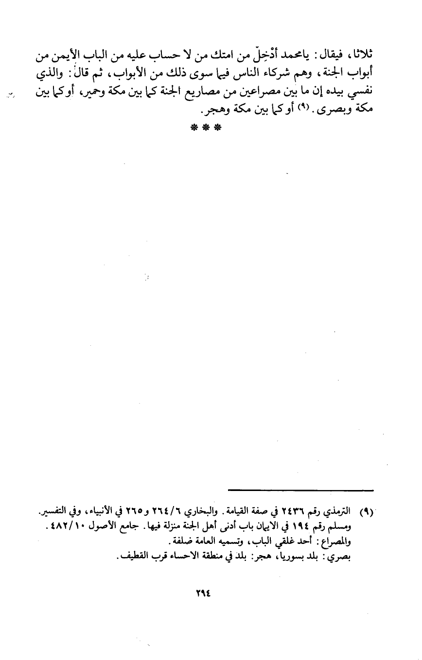 ثَلَاثًا فَيُقَال يَا مُحَمَّد أَدخل من أمتك من لَا حِسَاب عَلَيْهِ من الْبَاب الْأَيْمن من أَبْوَاب الْجنَّة وهم شُرَكَاء النَّاس فِيمَا سوى ذَلِك من الْأَبْوَاب ثمَّ قَالَ وَالَّذِي نَفسِي بِيَدِهِ إِن مَا بَين مصراعين من مصاريع الْجنَّة كَمَا بَين مَكَّة وحمير أَو كَمَا بَين مَكَّة وَبصرى أَو كَمَا بَين مَكَّة وهجر