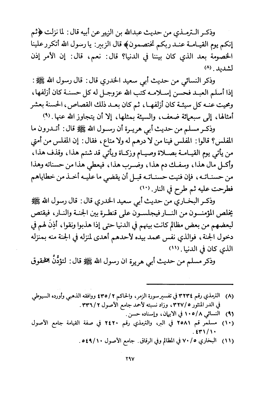 وَذكر التِّرْمِذِيّ من حَدِيث عبد الله بن الزبير عَن أَبِيه قَالَ لما نزلت ثمَّ إِنَّكُم يَوْم الْقِيَامَة عِنْد ربكُم تختصمون قَالَ الزبير يَا رَسُول الله أتكرر علينا الْخُصُومَة بعد الَّذِي كَانَ بَيْننَا فِي الدُّنْيَا قَالَ نعم قَالَ إِن الْأَمر إِذن لشديد
