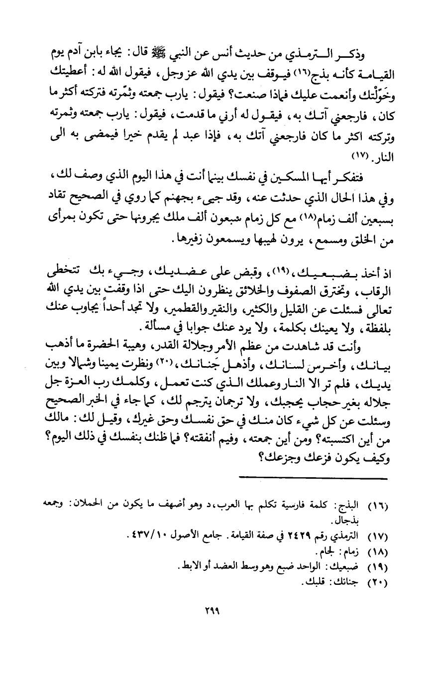 وَذكر التِّرْمِذِيّ من حَدِيث أنس عَن النَّبِي صلى الله عَلَيْهِ وَسلم قَالَ يجاء بِابْن آدم يَوْم الْقِيَامَة كَأَنَّهُ بذج فَيُوقف بَين يَدي الله عز وَجل فَيَقُول الله لَهُ أَعطيتك وخولتك وأنعمت عَلَيْك فَمَاذَا صنعت فَيَقُول يَا رب جمعته وثمرته فتركته أَكثر مَا كَانَ فارجعني آتِك بِهِ فَيَقُول لَهُ أَرِنِي مَا قدمت فَيَقُول يَا رب جمعته وثمرته وَتركته أَكثر مَا كَانَ فارجعني آتِك بِهِ فَإِذا عبد لم يقدم خيرا فيمضى بِهِ إِلَى النَّار