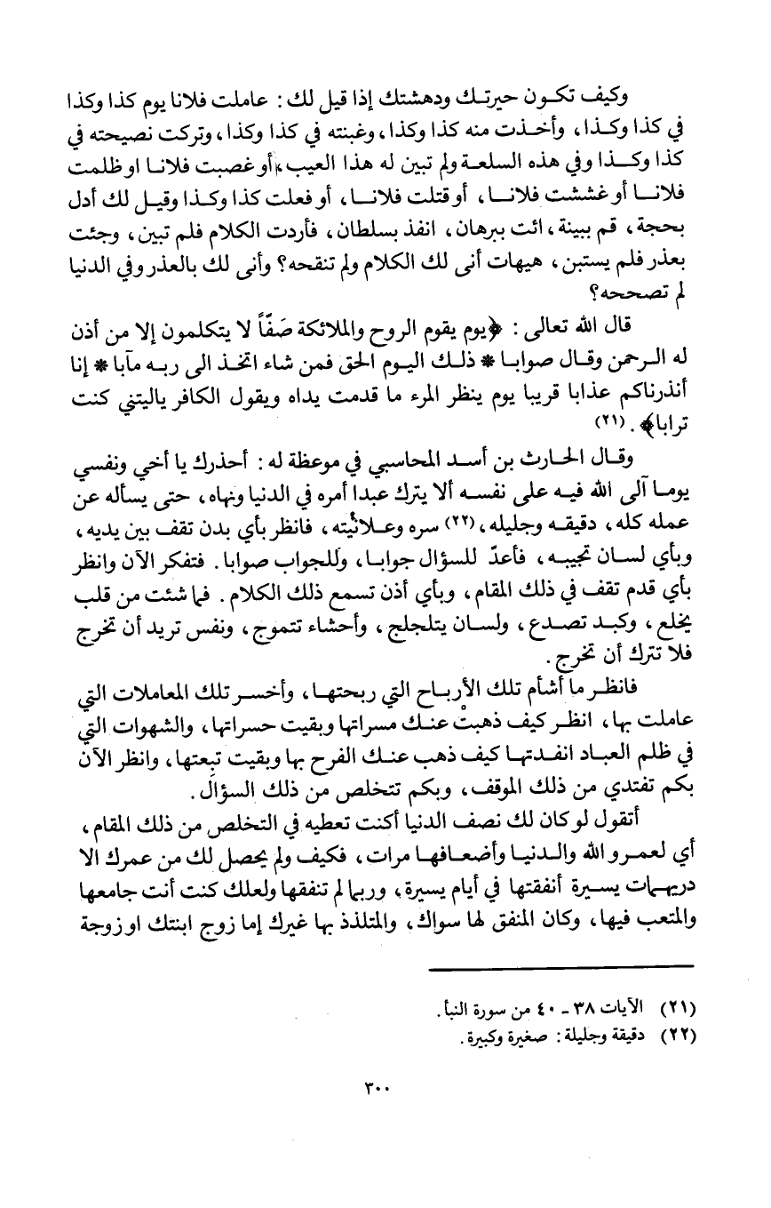 وَقَالَ الْحَارِث بن أَسد المحاسبي فِي موعظة لَهُ أحذرك يَا أخي وَنَفْسِي يَوْمًا إِلَى الله فِيهِ على نَفسه أَلا يتْرك عبدا أمره فِي الدُّنْيَا وَنَهَاهُ حَتَّى يسْأَله عَن عمله كُله دقيقه وجليله سره وعلانيته فَانْظُر بِأَيّ بدن تقف بَين يَدَيْهِ وَبِأَيِّ لِسَان تجيبه فأعد للسؤال جَوَابا وللجواب صَوَابا فتفكر الْآن وَانْظُر بِأَيّ قدم تقف فِي ذَلِك الْمقَام وَبِأَيِّ أذن تسمع ذَلِك الْكَلَام فَمَا شِئْت من قلب يخلع وكبد تصدع ولسان يتلجلج وأحشاء تتموج وَنَفس تُرِيدُ أَن تخرج فَلَا تتْرك أَن تخرج