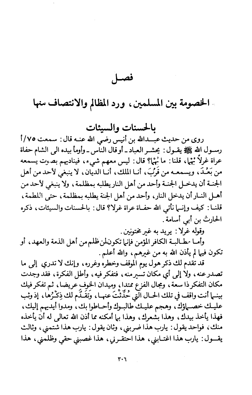 فصل الْخُصُومَة بَين الْمُسلمين ورد الْمَظَالِم والانتصاف مِنْهَا بِالْحَسَنَاتِ والسيئات