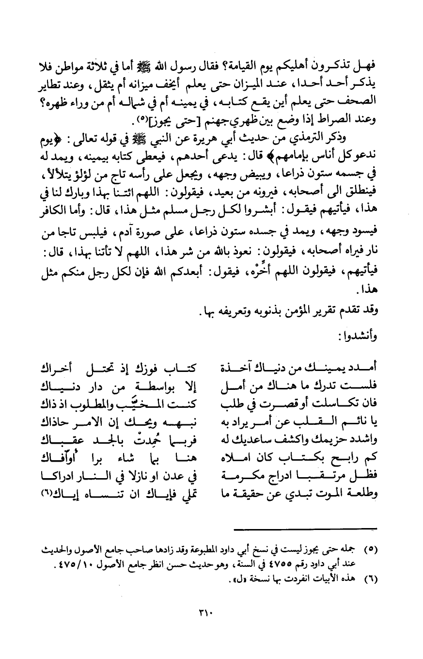 وَذكر التِّرْمِذِيّ من حَدِيث أبي هُرَيْرَة عَن النَّبِي صلى الله عَلَيْهِ وَسلم فِي قَوْله تَعَالَى يَوْم نَدْعُو كل أنَاس بإمامهم قَالَ يدعى أحدهم فَيعْطى كِتَابه بِيَمِينِهِ ويمد لَهُ فِي جِسْمه سِتُّونَ ذِرَاعا ويبيض وَجهه وَيجْعَل على رَأسه تَاج من لُؤْلُؤ يتلألأ فَينْطَلق إِلَى أَصْحَابه فيرونه من بعيد فَيَقُولُونَ اللَّهُمَّ ائتنا بِهَذَا وَبَارك لنا فِي هَذَا فيأتيهم فَيَقُول أَبْشِرُوا لكل رجل مُسلم مثل هَذَا قَالَ وَأما الْكَافِر فيسود وَجهه ويمد فِي جسده سِتُّونَ ذِرَاعا على صُورَة آدم فيلبس تاجا من نَار فيراه أَصْحَابه فَيَقُولُونَ نَعُوذ بِاللَّه من شَرّ هَذَا اللَّهُمَّ لَا تأتنا بِهَذَا قَالَ فيأتيهم فَيَقُولُونَ اللَّهُمَّ أَخّرهُ فَيَقُول أبعدكم الله فَإِن لكل رجل مِنْكُم مثل هَذَا