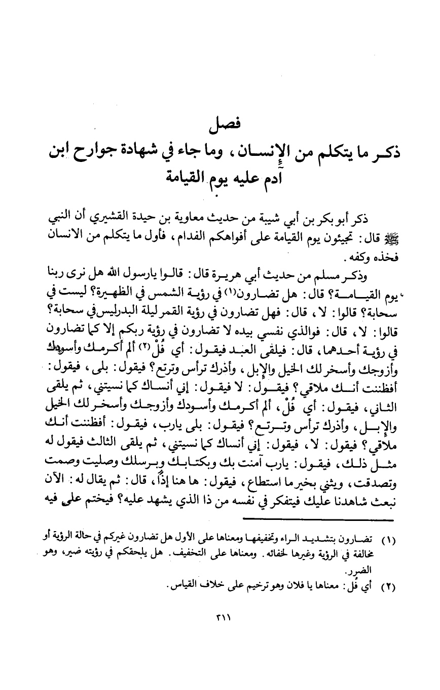 وَذكر مُسلم من حَدِيث أبي هُرَيْرَة قَالَ قَالُوا يَا رَسُول الله هَل نرى رَبنَا يَوْم الْقِيَامَة قَالَ هَل تضَارونَ فِي رُؤْيَة الشَّمْس فِي الظهيرة لَيست فِي سَحَابَة قَالُوا لَا قَالَ فَهَل تضَارونَ فِي رُؤْيَة الْقَمَر لَيْلَة الْبَدْر لَيْسَ فِي سَحَابَة قَالُوا لَا قَالَ فوالذي نَفسِي بِيَدِهِ لَا تضَارونَ فِي رُؤْيَة ربكُم إِلَّا كَمَا تضَارونَ فِي رُؤْيَة أَحدهمَا قَالَ فَيلقى العَبْد فَيَقُول أَي فل ألم أكرمك وأسودك وأزوجك وأسخر لَك الْخَيل وَالْإِبِل وأذرك ترأس وترتع فَيَقُول بلَى فَيَقُول أفظننت أَنَّك ملاقي فَيَقُول لَا فَيَقُول إِنِّي أنساك كَمَا نسيتني ثمَّ يلقى الثَّانِي فَيَقُول أَي فل ألم أكرمك وأسودك وأزوجك وأسخر لَك الْخَيل وَالْإِبِل وأذرك ترأس وترتع فَيَقُول بلَى يَا رب فَيَقُول أفظننت أَنَّك ملاقي فَيَقُول لَا فَيَقُول إِنِّي أنساك كَمَا نسيتني ثمَّ يلقى الثَّالِث فَيَقُول لَهُ مثل ذَلِك فَيَقُول يَا رب آمَنت بك وبكتابك وبرسلك وَصليت وَصمت وتصدقت ويثني بِخَير مَا اسْتَطَاعَ فَيَقُول هَا هُنَا إِذا قَالَ ثمَّ يُقَال لَهُ الْآن نبعث شاهدنا عَلَيْك فيتفكر فِي نَفسه من ذَا الَّذِي يشْهد عَلَيْهِ فيختم على فِيهِ