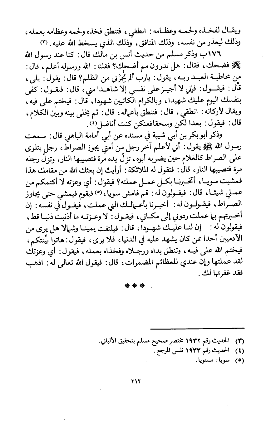 وَذكر مُسلم من حَدِيث أنس بن مَالك قَالَ كُنَّا عِنْد رَسُول الله صلى الله عَلَيْهِ وَسلم فَضَحِك فَقَالَ هَل تَدْرُونَ مِم أضْحك فَقُلْنَا الله وَرَسُوله أعلم قَالَ من مُخَاطبَة العَبْد ربه يَقُول يَا رب ألم تُجِرْنِي من الظُّلم قَالَ يَقُول بلَى قَالَ فَيَقُول فَإِنِّي لَا أُجِيز على نَفسِي إِلَّا شَاهدا مني قَالَ فَيَقُول كفى بِنَفْسِك الْيَوْم عَلَيْك شَهِيدا وَبِالْكِرَامِ الْكَاتِبين شُهُودًا قَالَ فيختم على فِيهِ وَيُقَال لِأَرْكَانِهِ انْطِقِي قَالَ فَتَنْطِق بِأَعْمَالِهِ قَالَ ثمَّ يخلى بَينه وَبَين الْكَلَام قَالَ فَيَقُول بعدا لَكِن وَسُحْقًا فَعَنْكُنَّ كنت أُنَاضِل