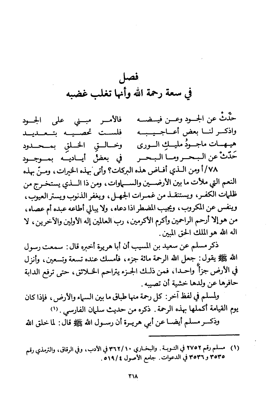 ذكر مُسلم عَن سعيد بن الْمسيب أَن أَبَا هُرَيْرَة أخبرهُ قَالَ سَمِعت رَسُول الله صلى الله عَلَيْهِ وَسلم يَقُول جعل الله الرَّحْمَة مائَة جُزْء فَأمْسك عِنْده تِسْعَة وَتِسْعين وَأنزل فِي الأَرْض جزأ وَاحِدًا فَمن ذَلِك الْجُزْء يتراحم الْخَلَائق حَتَّى ترفع الدَّابَّة حافرها عَن وَلَدهَا خشيَة أَن تصيبه